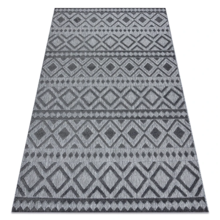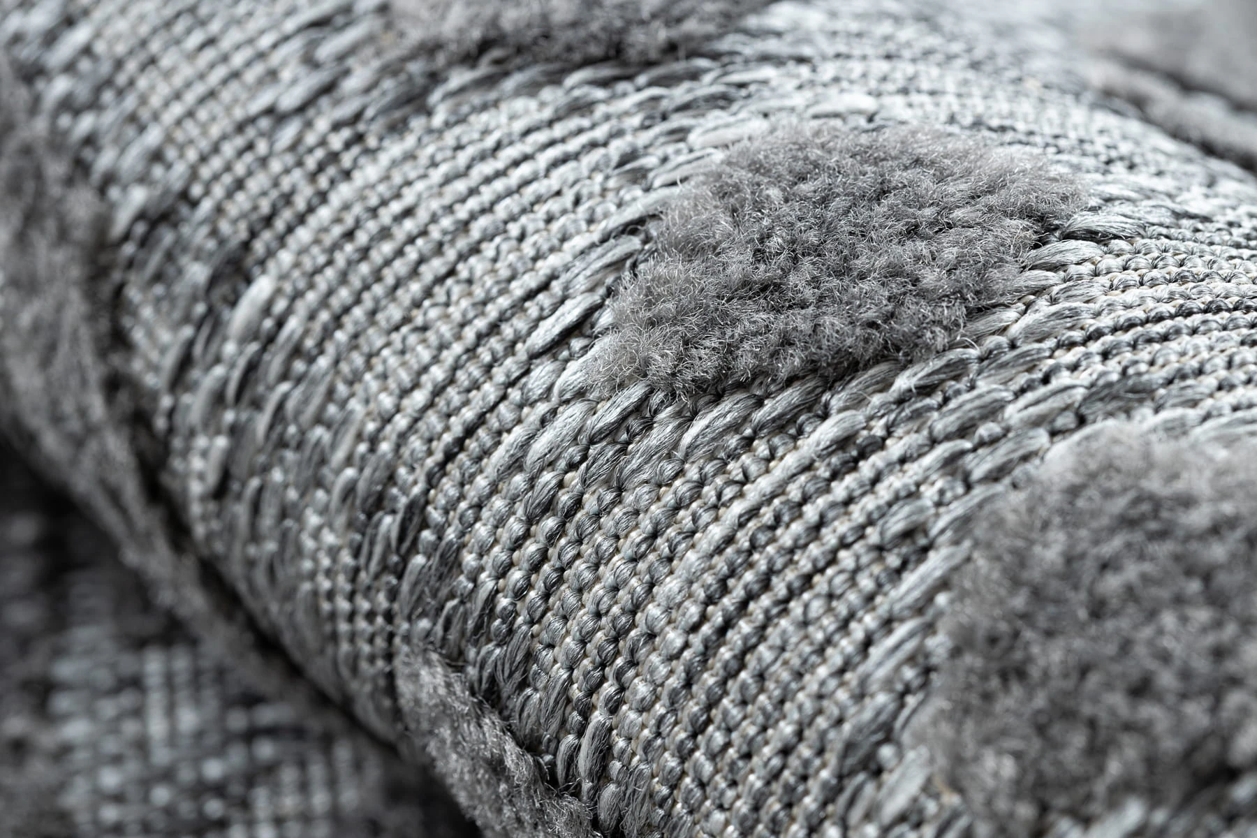 Szary dywan z geometrycznym wzorem w stylu boho, który doskonale sprawdzi się w salonie, dodając wnętrzu nowoczesnego charakteru.