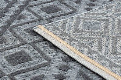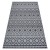 Szary dywan z geometrycznym wzorem w stylu boho, który doskonale sprawdzi się w salonie, dodając wnętrzu nowoczesnego charakteru.