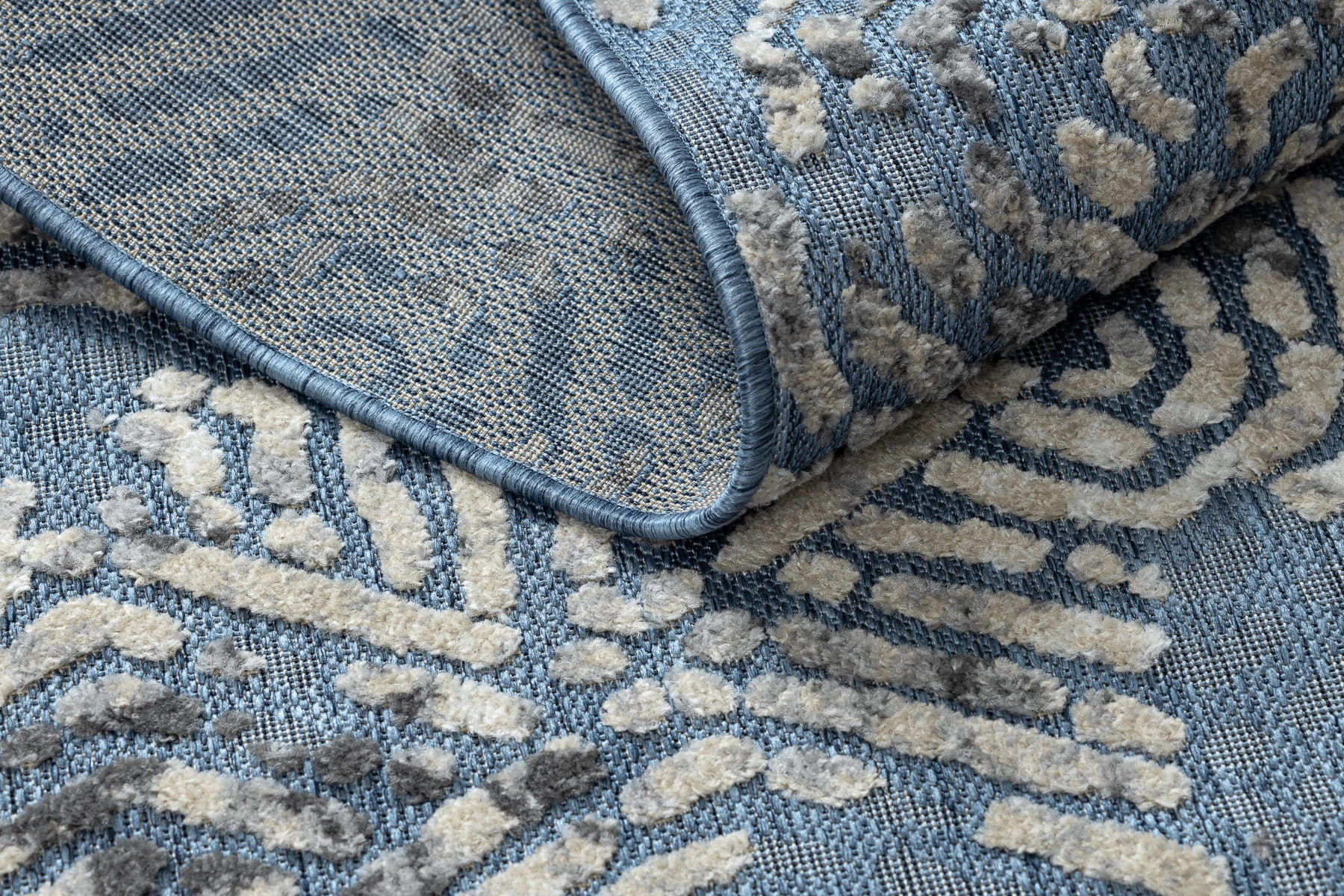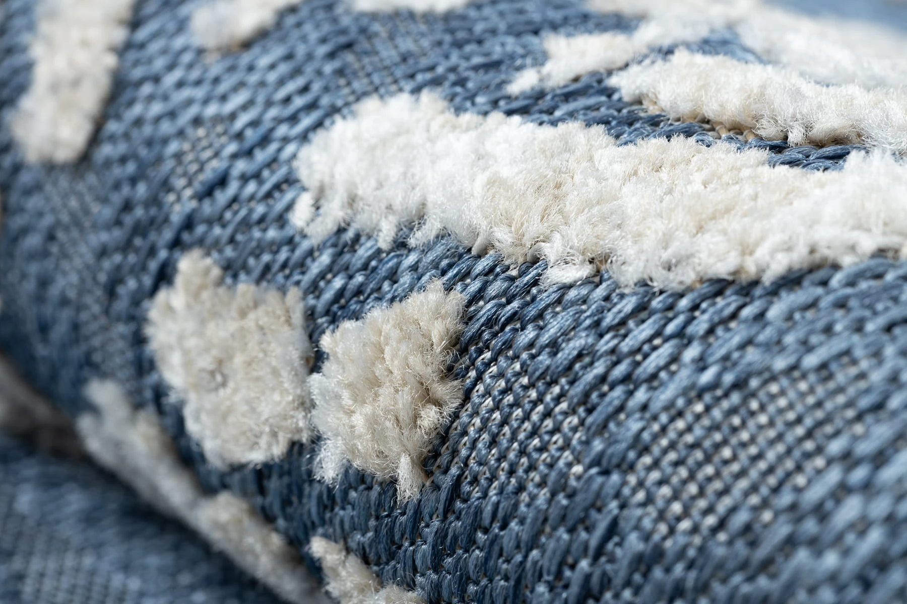 Niebieski dywan z abstrakcyjnym wzorem heksagonów, który doda salonowi nowoczesny charakter i podkreśli geometryczny styl wnętrza.