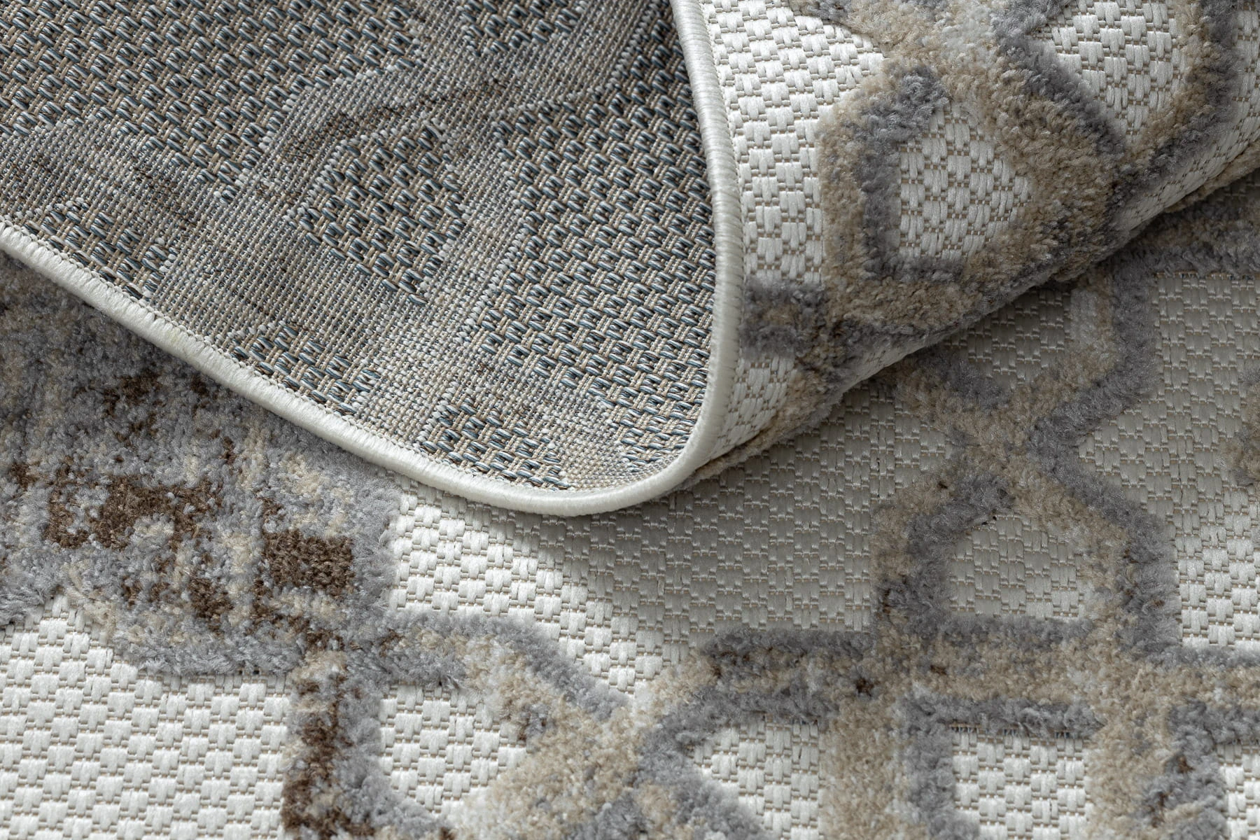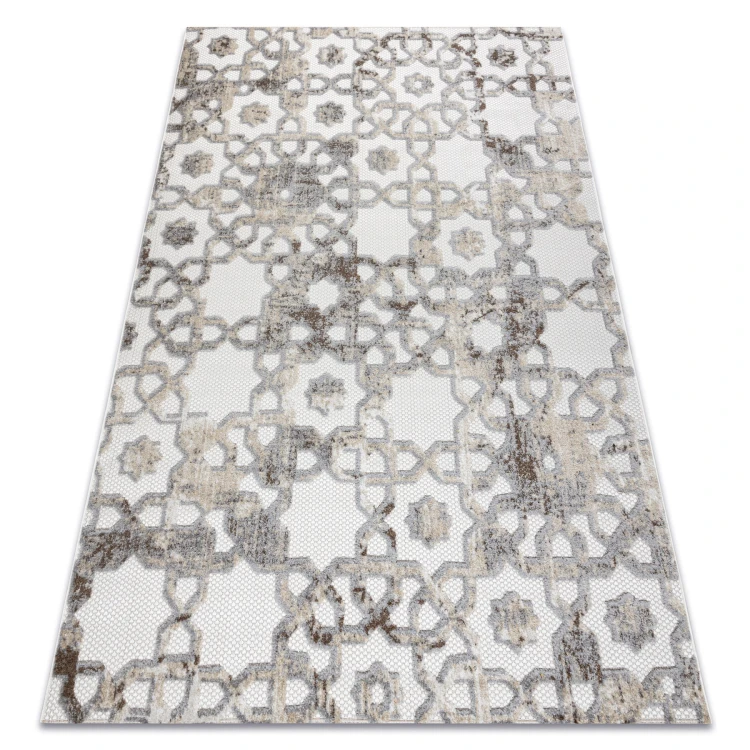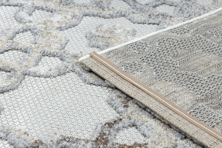Beżowo-szary dywan z abstrakcyjnym wzorem, który doskonale sprawdzi się w salonie, tworząc stonowaną elegancję.