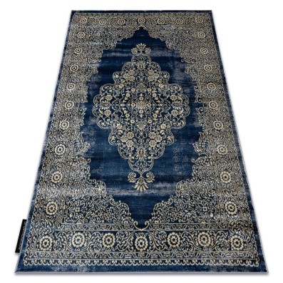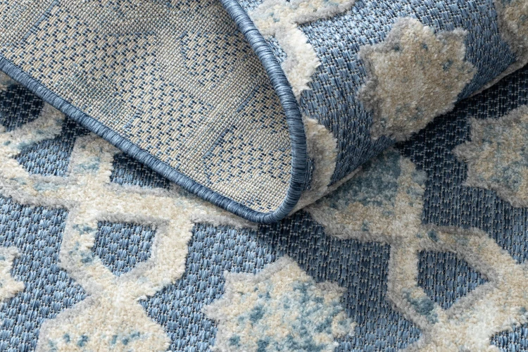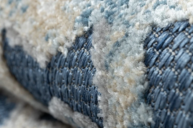 Niebieski dywan z abstrakcyjnym wzorem w beżowych akcentach, który doskonale sprawdzi się w nowoczesnym salonie lub pokoju.