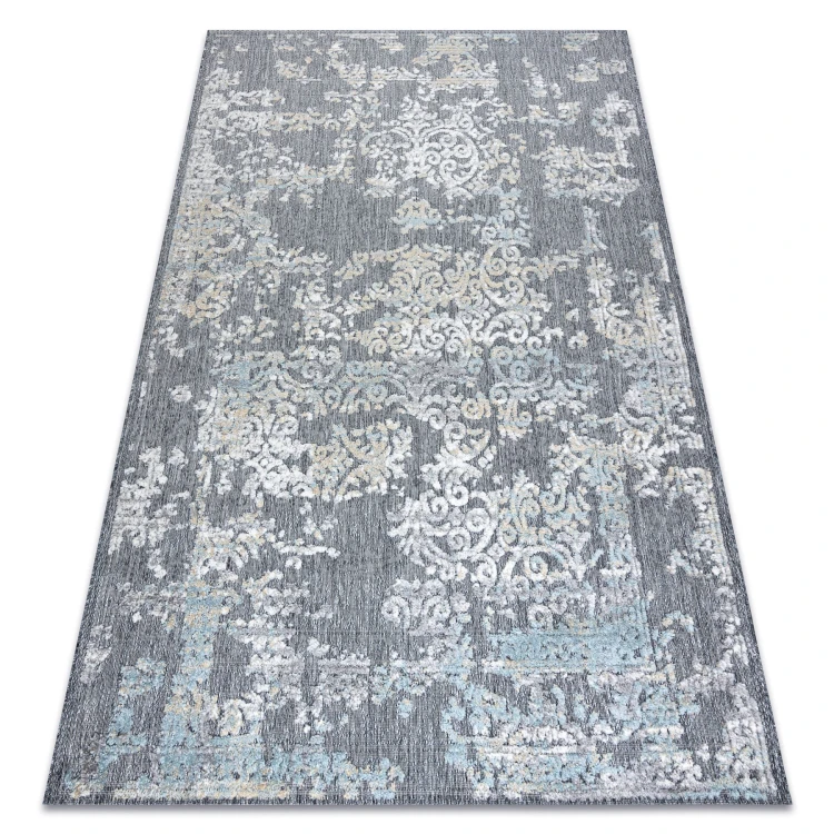Szaro-beżowy dywan z abstrakcyjnym wzorem, który doskonale wpisze się w nowoczesny salon lub pokój.