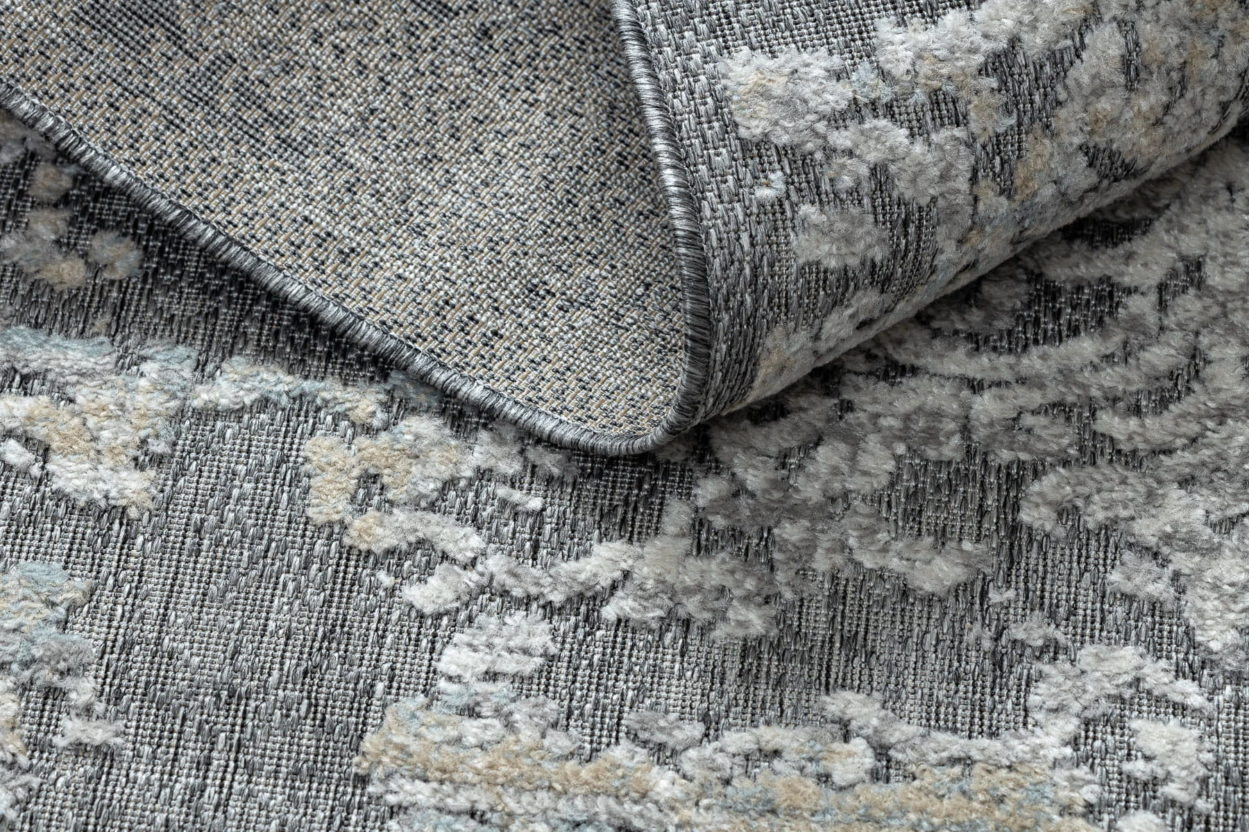 Szaro-beżowy dywan z abstrakcyjnym wzorem, który doskonale wpisze się w nowoczesny salon lub pokój.