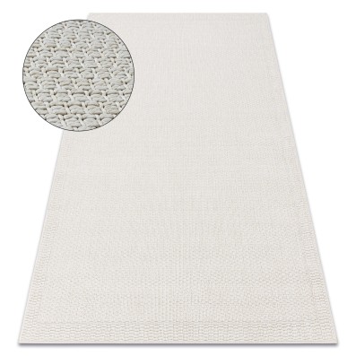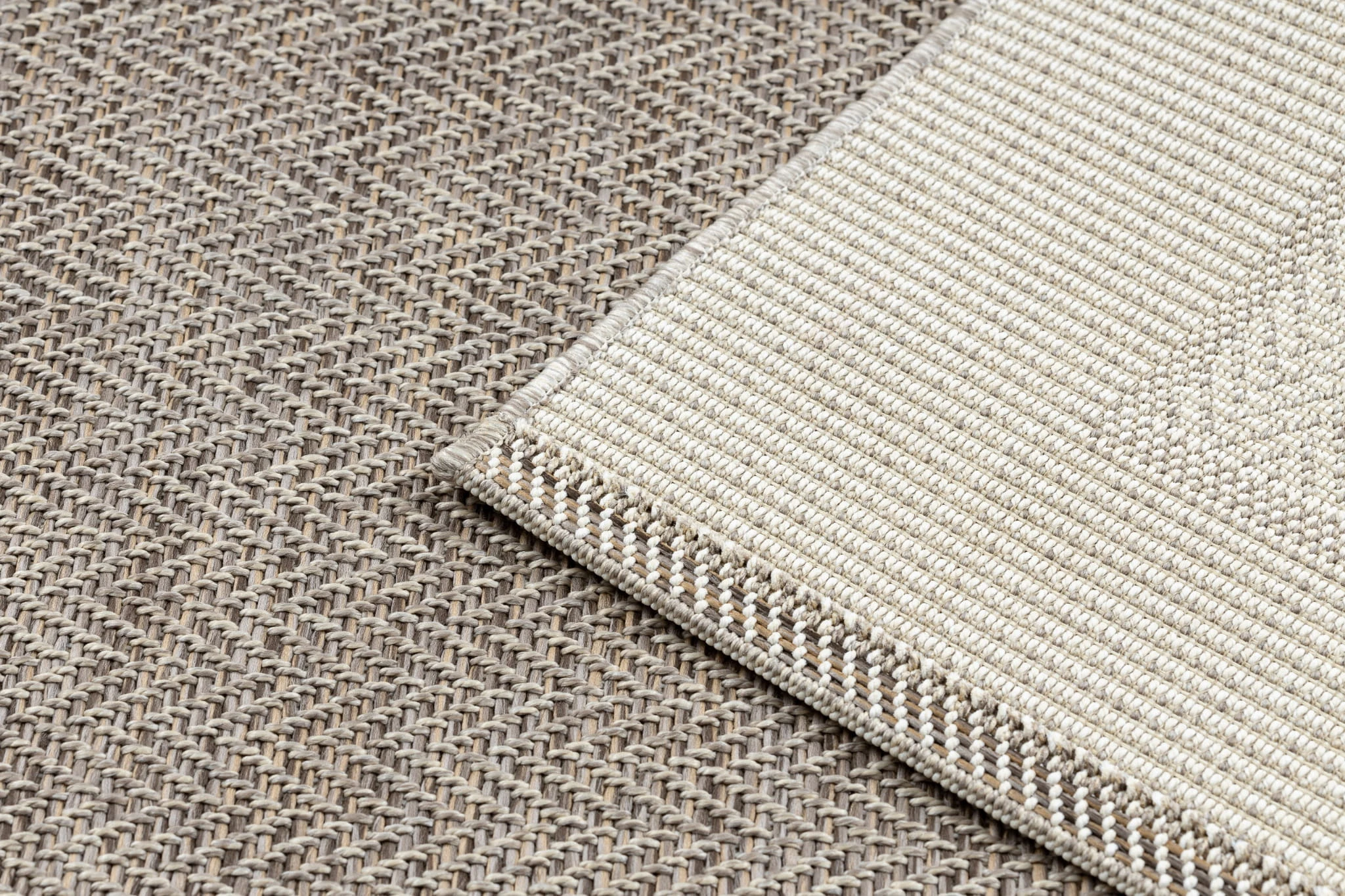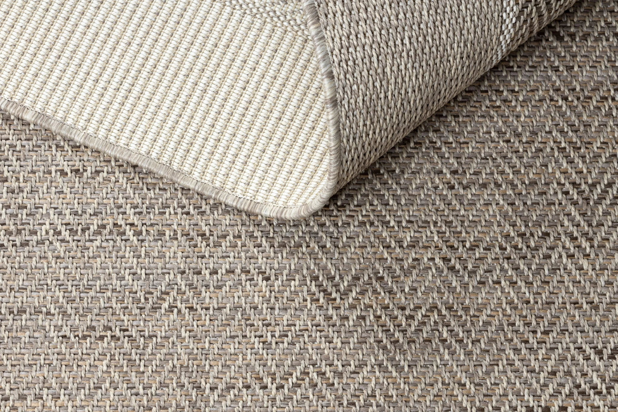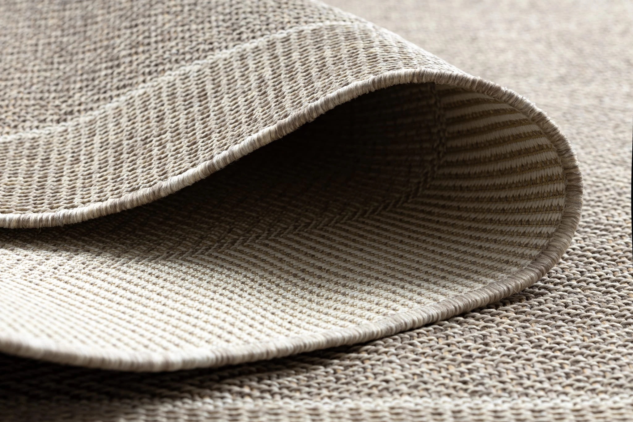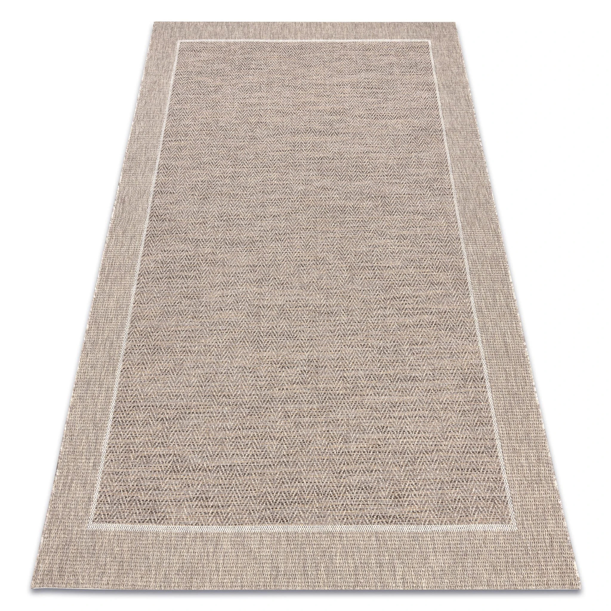 Sznurkowy dywan w odcieniach beżu z delikatną ramką, odporny na warunki atmosferyczne, idealny na taras i balkon.
