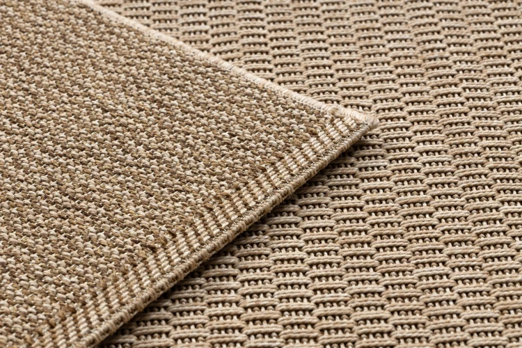 Sznurkowy dywan w odcieniu beżu, odporny na warunki atmosferyczne, idealny na taras i balkon.