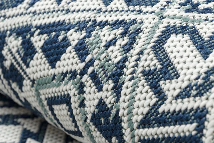 Sznurkowy dywan w odcieniach niebieskiego, odporny na warunki atmosferyczne, idealny na taras i balkon.