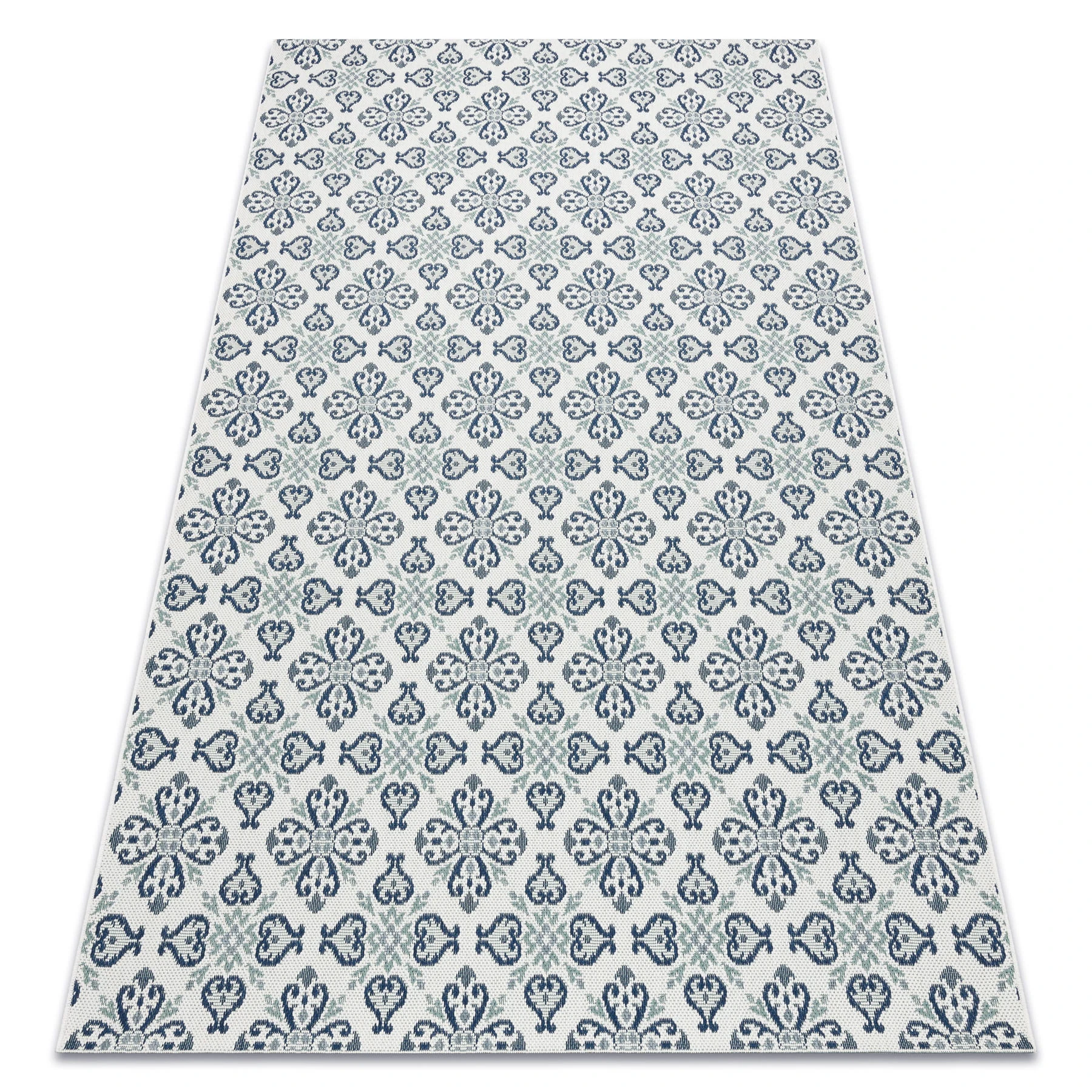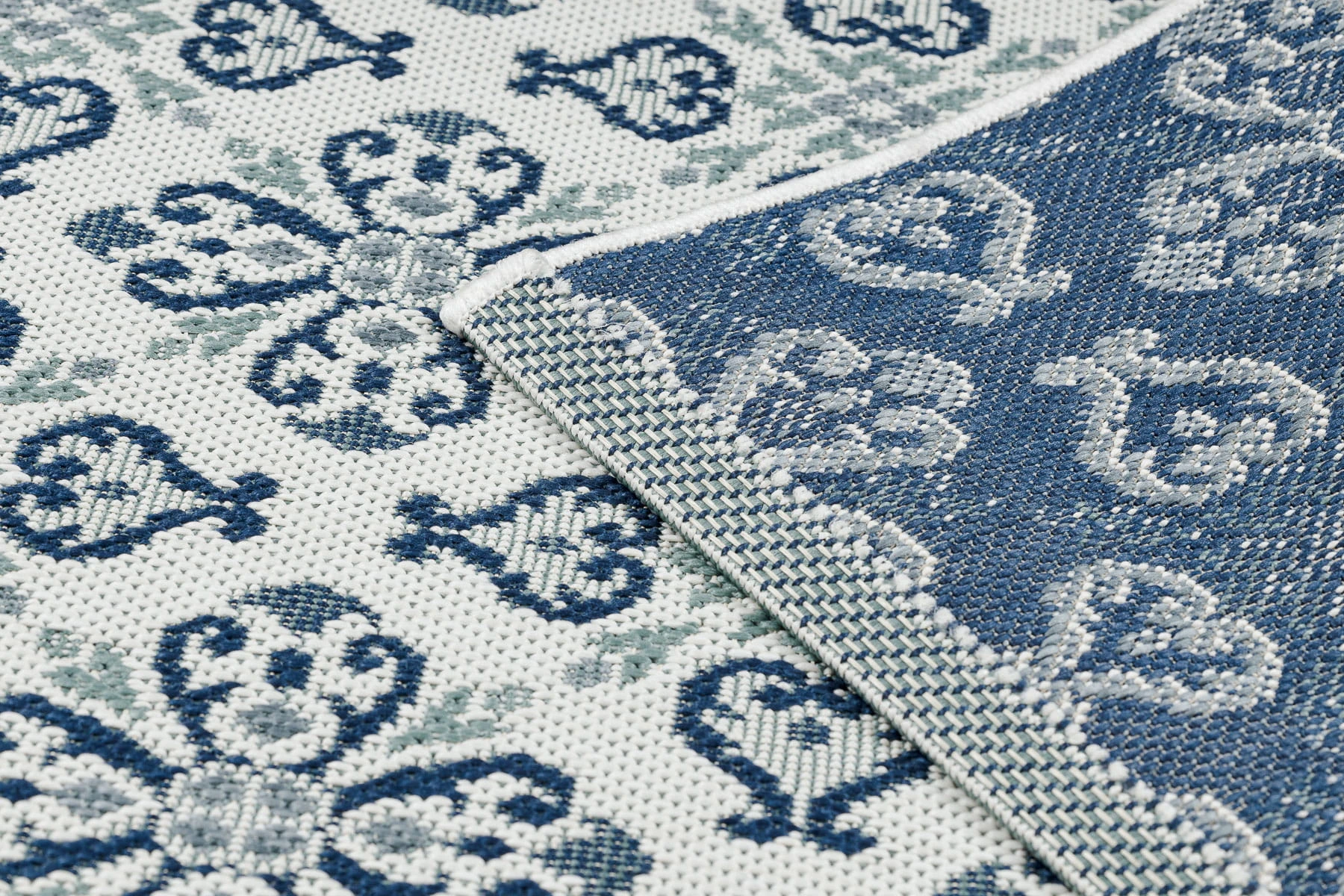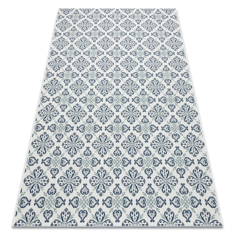 Sznurkowy dywan w odcieniach niebieskiego, odporny na warunki atmosferyczne, idealny na taras i balkon.
