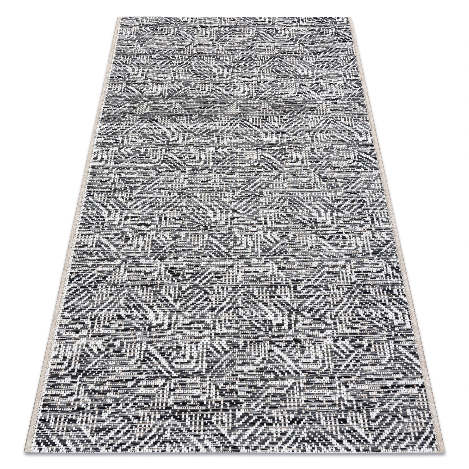 Sznurkowy dywan w odcieniach szarości i beżu, odporny na warunki atmosferyczne, idealny na taras i balkon.