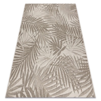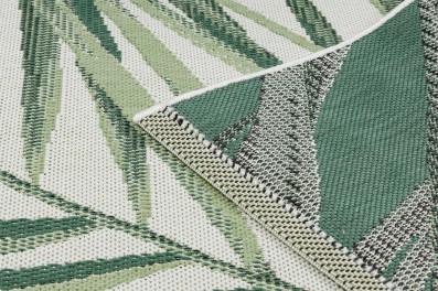 Sznurkowy dywan w odcieniu zieleni z roślinnym motywem liści, odporny na warunki atmosferyczne, idealny na taras i balkon.