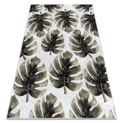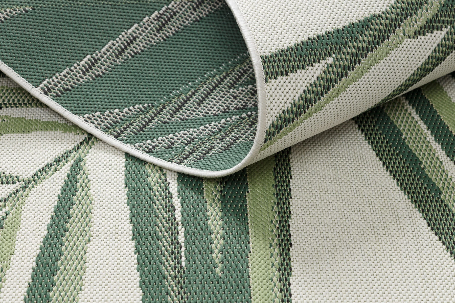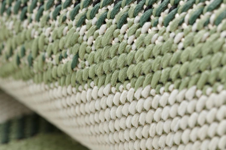Sznurkowy dywan w odcieniu zieleni z roślinnym motywem liści, odporny na warunki atmosferyczne, idealny na taras i balkon.