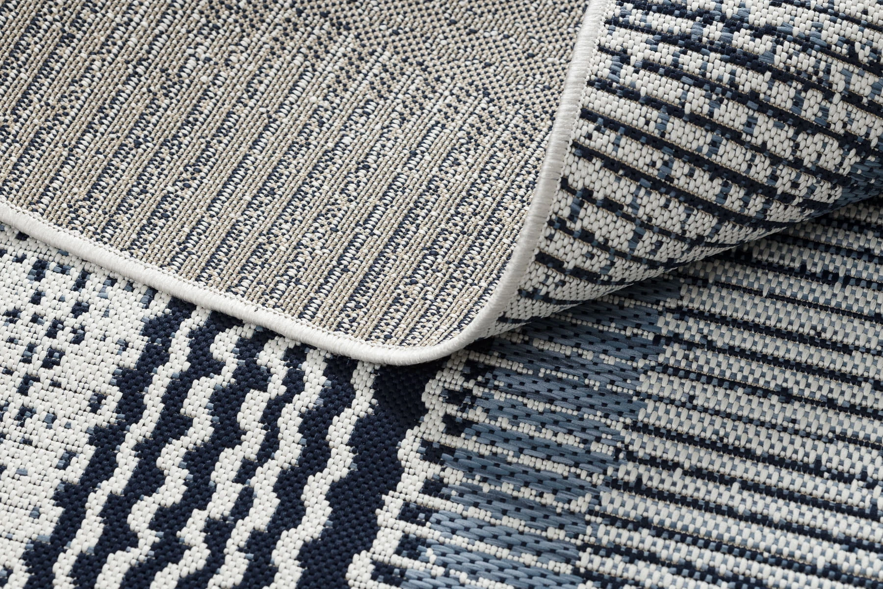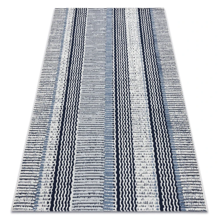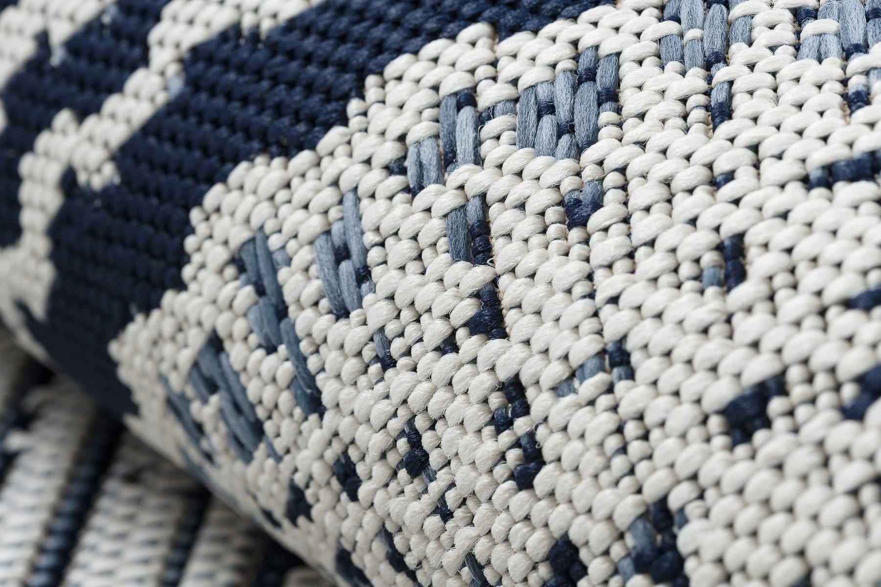Sznurkowy dywan w niebieskie pasy, odporny na warunki atmosferyczne, idealny na taras i balkon.