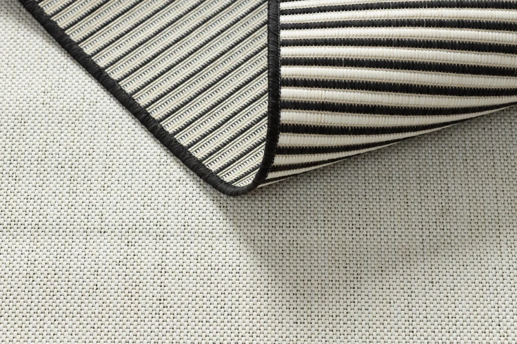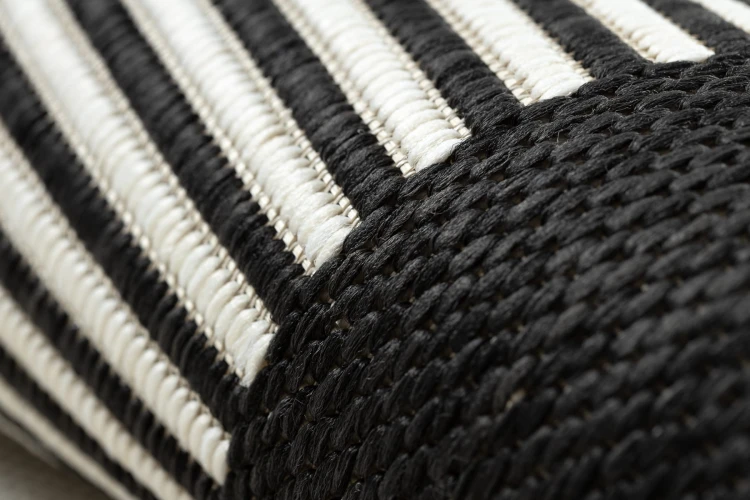 Sznurkowy dywan w odcieniach kremu i czerni, odporny na warunki atmosferyczne, idealny na taras i balkon.