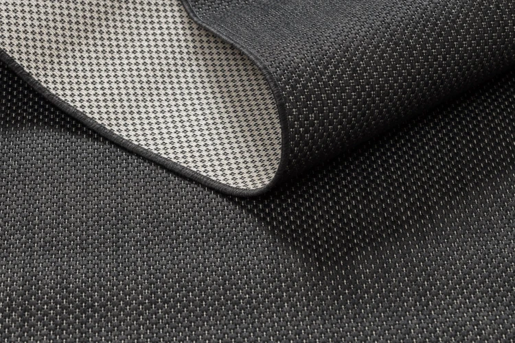 Sznurkowy dywan w głębokiej czerni, odporny na warunki atmosferyczne, idealny na taras i balkon.