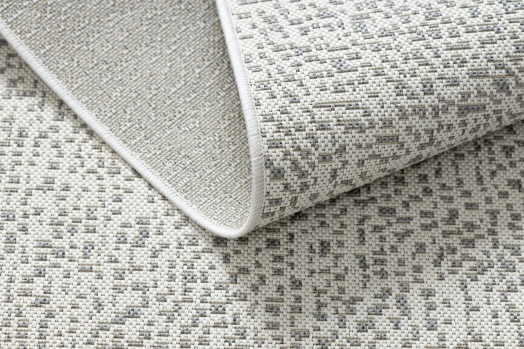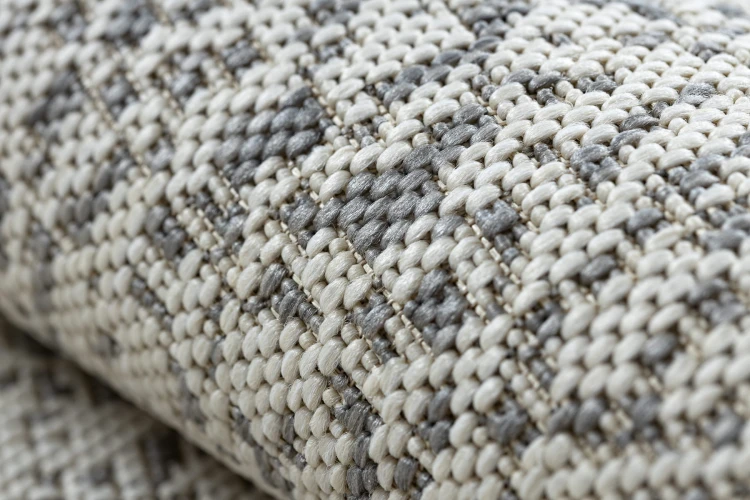 Sznurkowy dywan w odcieniach szarości i kremu, odporny na warunki atmosferyczne, idealny na taras i balkon.
