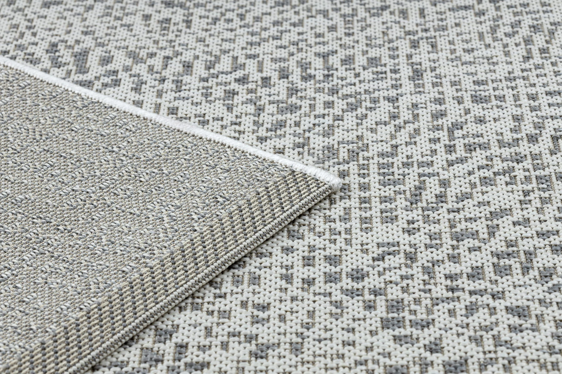 Sznurkowy dywan w odcieniach szarości i kremu, odporny na warunki atmosferyczne, idealny na taras i balkon.