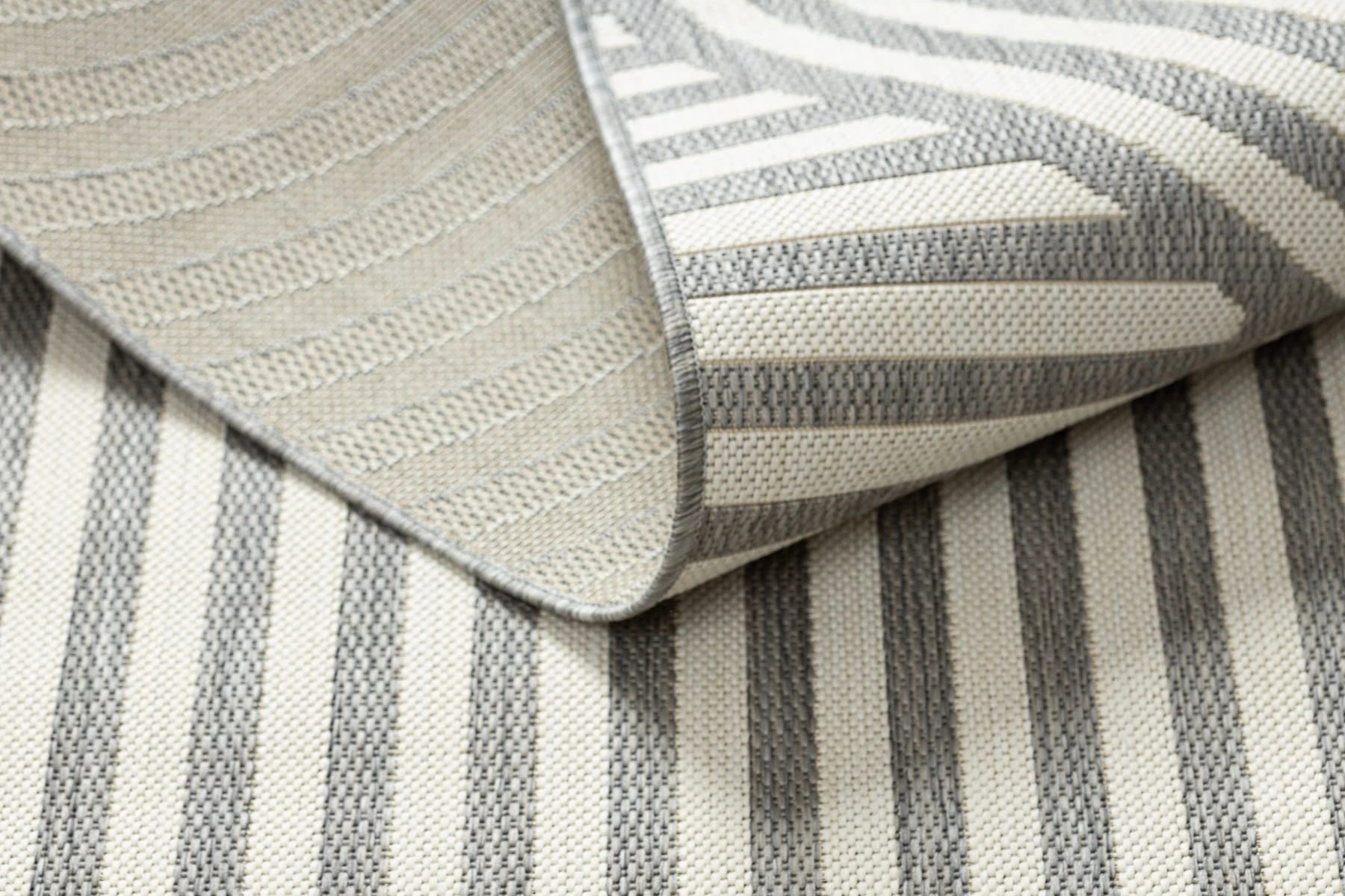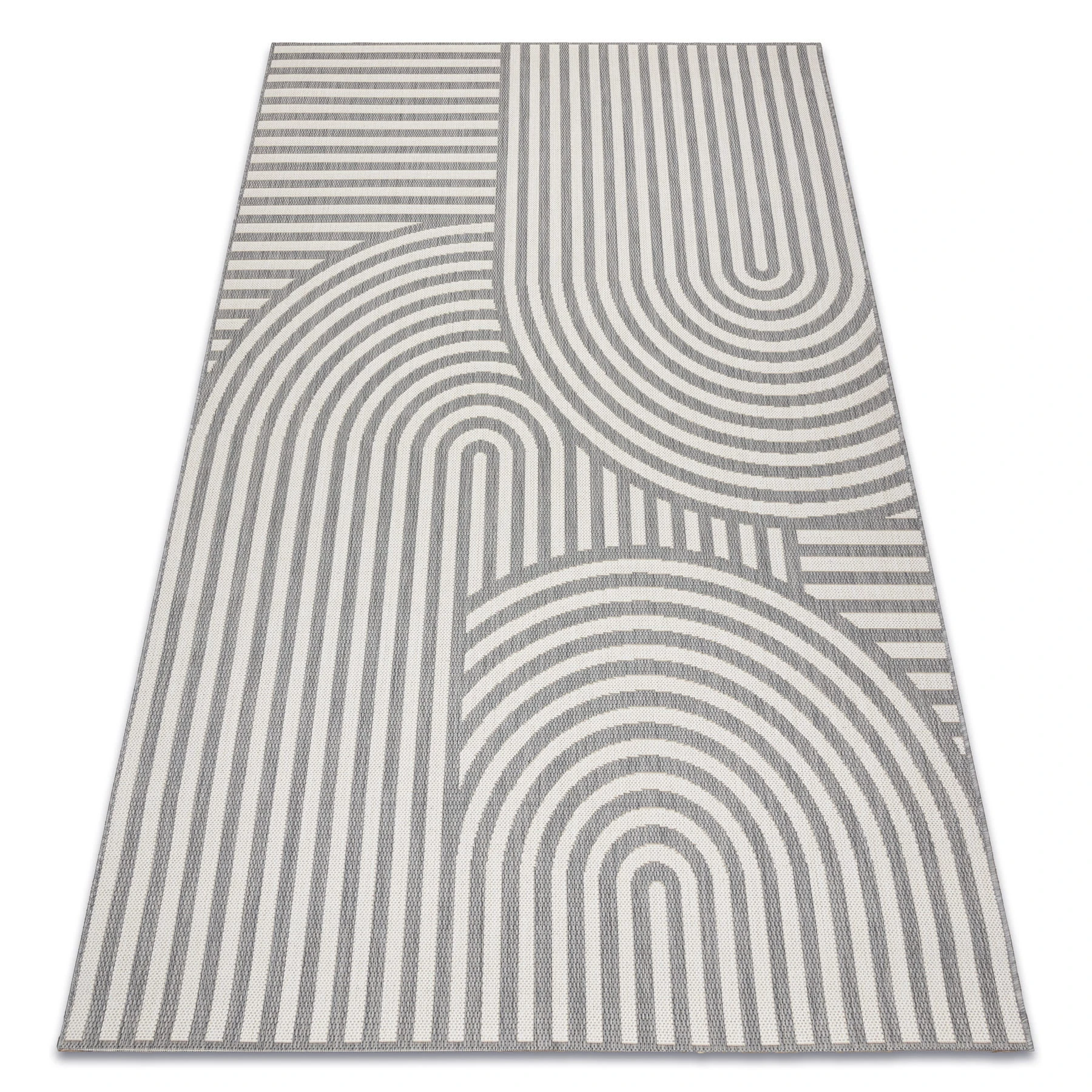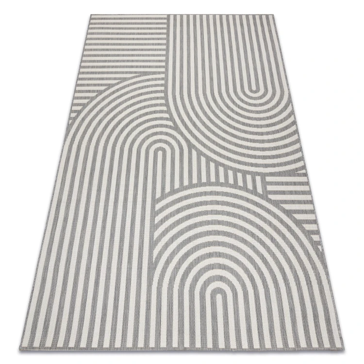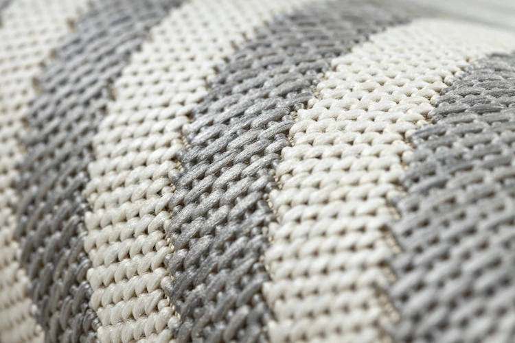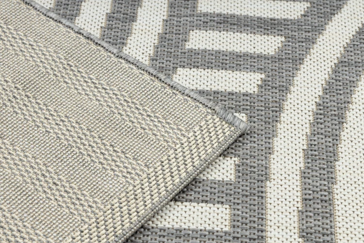 Sznurkowy dywan w odcieniach szarości i kremu, odporny na warunki atmosferyczne, idealny na taras i balkon.