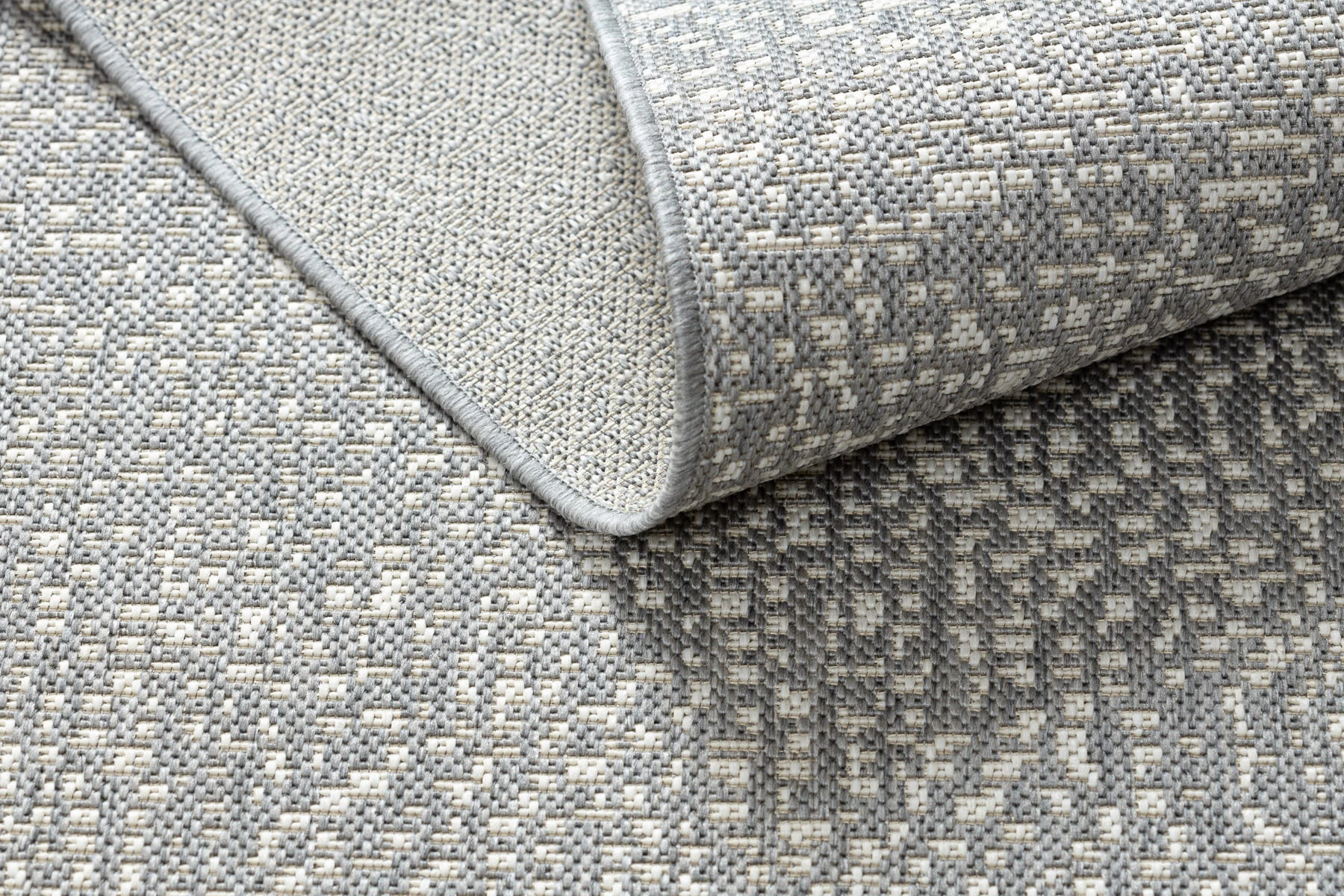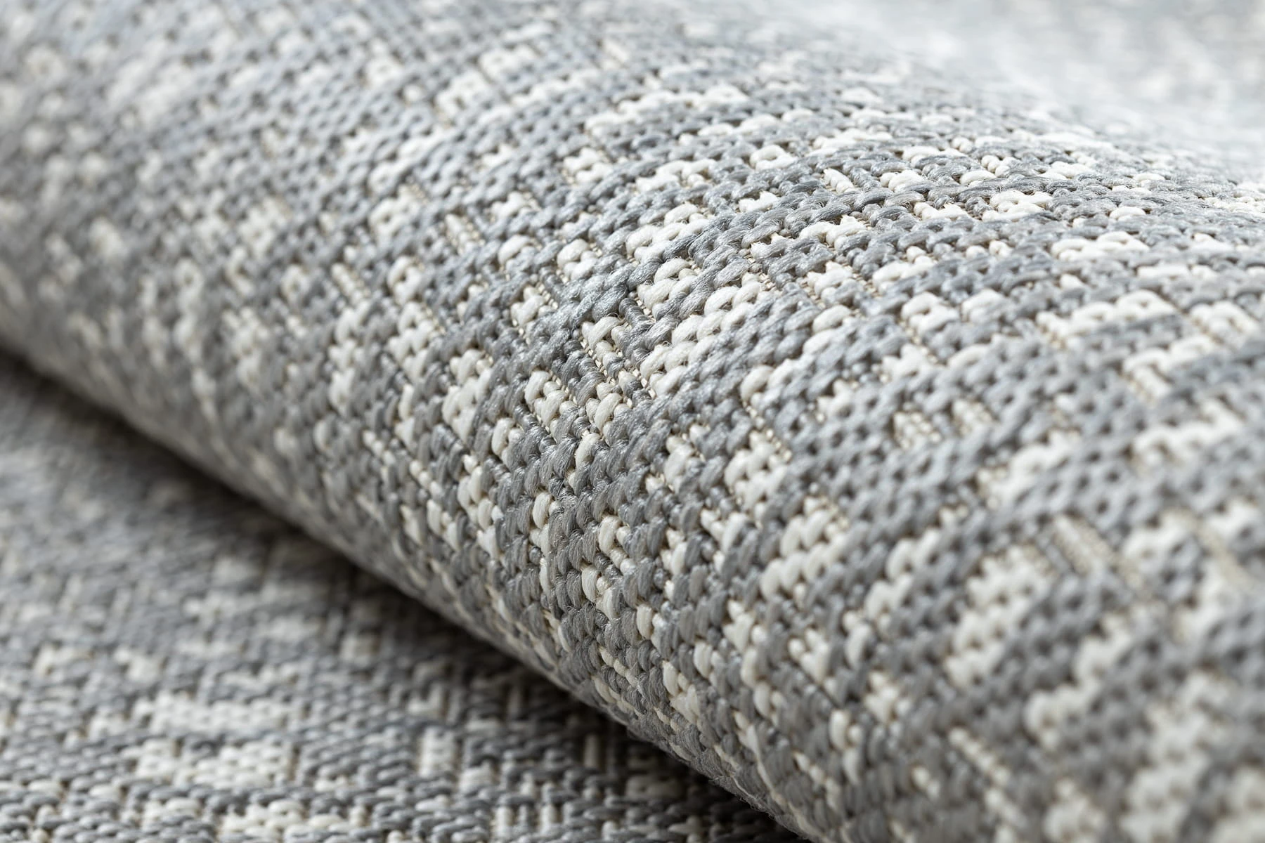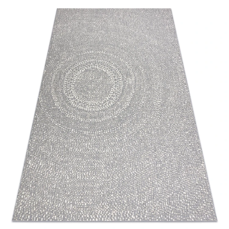 Sznurkowy dywan w odcieniach szarości i kremu, odporny na warunki atmosferyczne, idealny na taras i balkon.