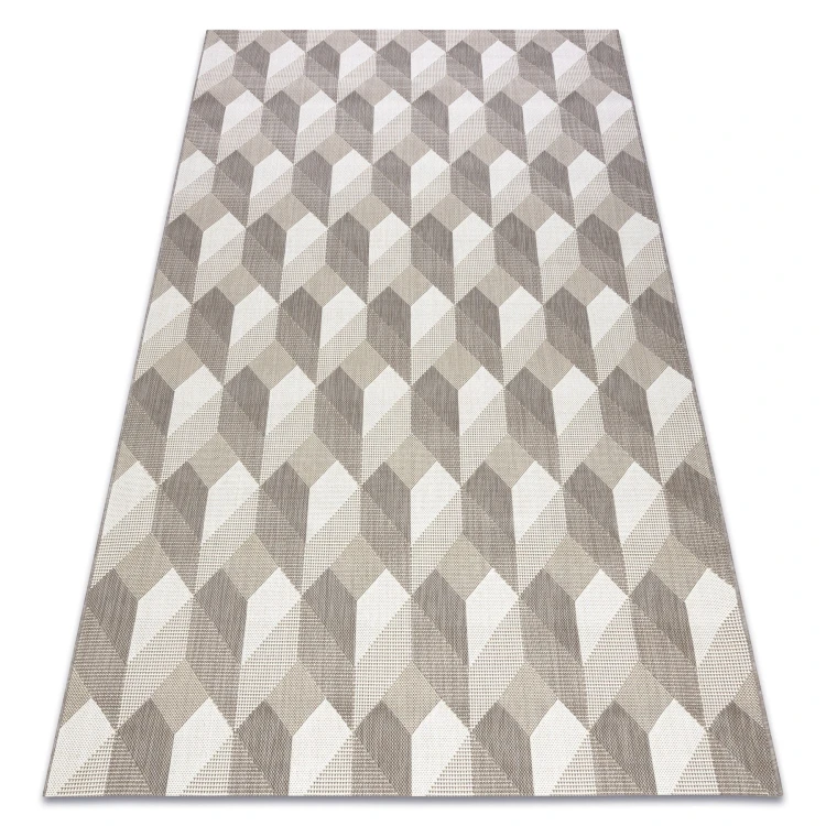 Sznurkowy dywan w odcieniach beżu z efektem trójwymiarowych kostek, odporny na warunki atmosferyczne, idealny na taras i balkon.