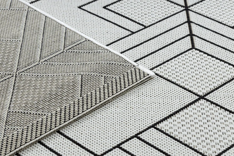 Sznurkowy dywan w odcieniach szarości i kremu, odporny na warunki atmosferyczne, idealny na taras i balkon.