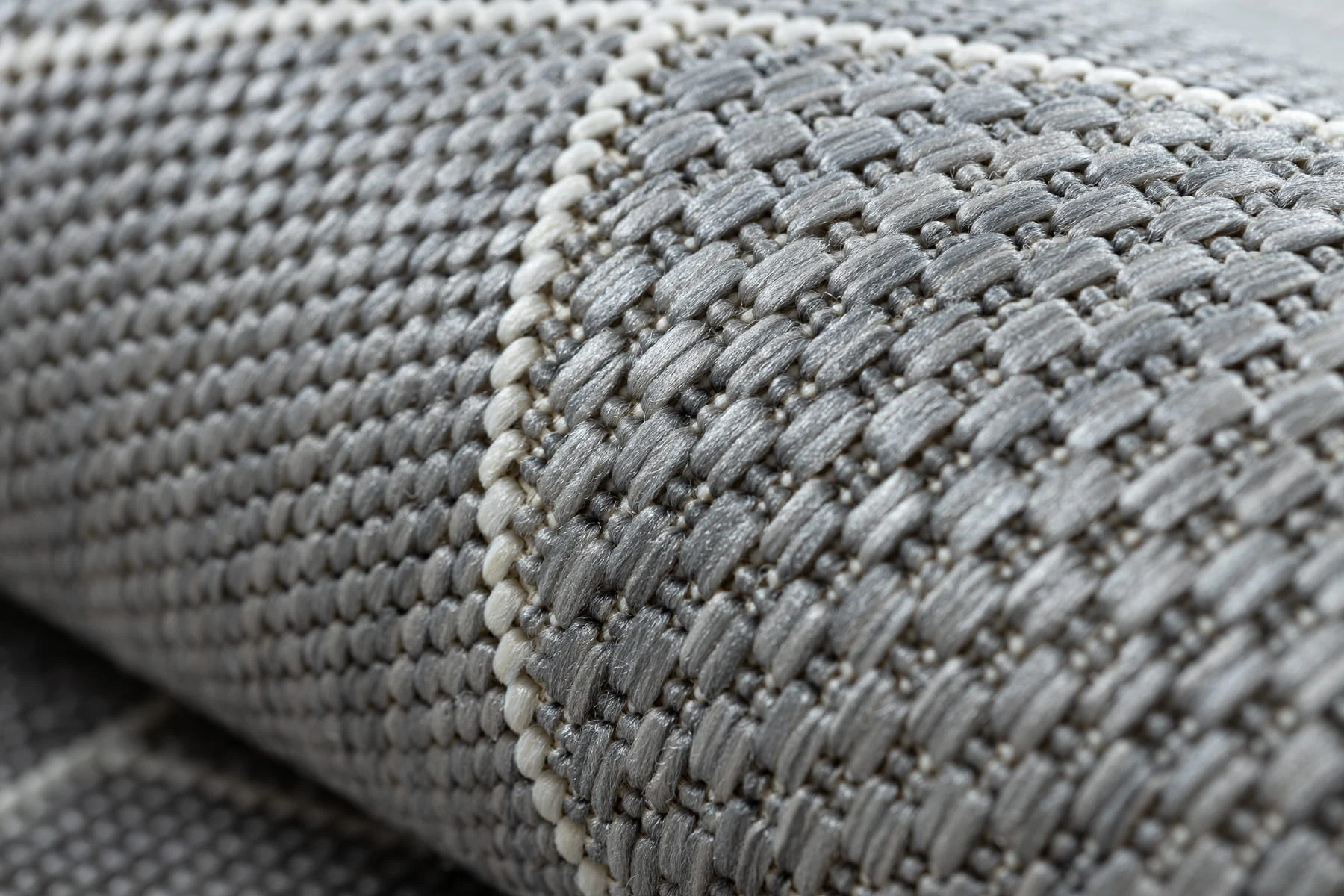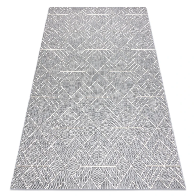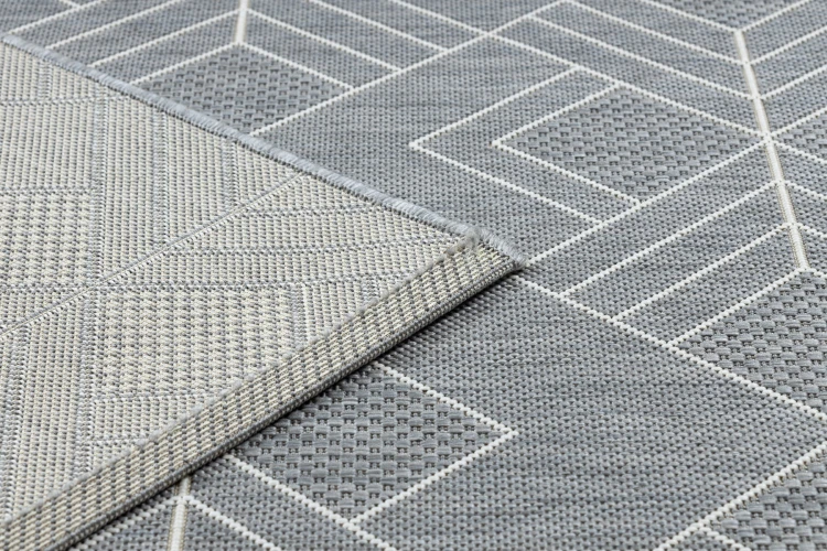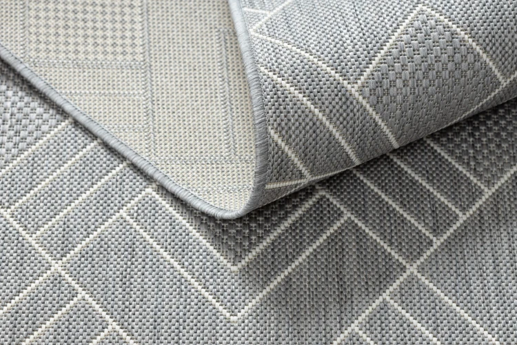 Szaro-kremowy dywan sznurkowy z geometrycznym wzorem, który idealnie sprawdzi się w korytarzu, nadając mu nowoczesny charakter.