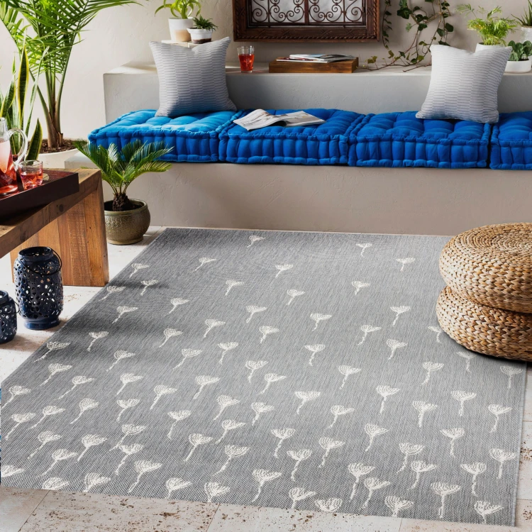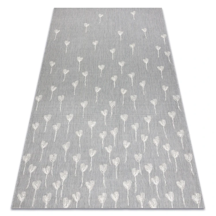 Szary dywan sznurkowy z delikatnym roślinnym wzorem, który doskonale sprawdzi się w korytarzu, dodając mu stonowanej elegancji.