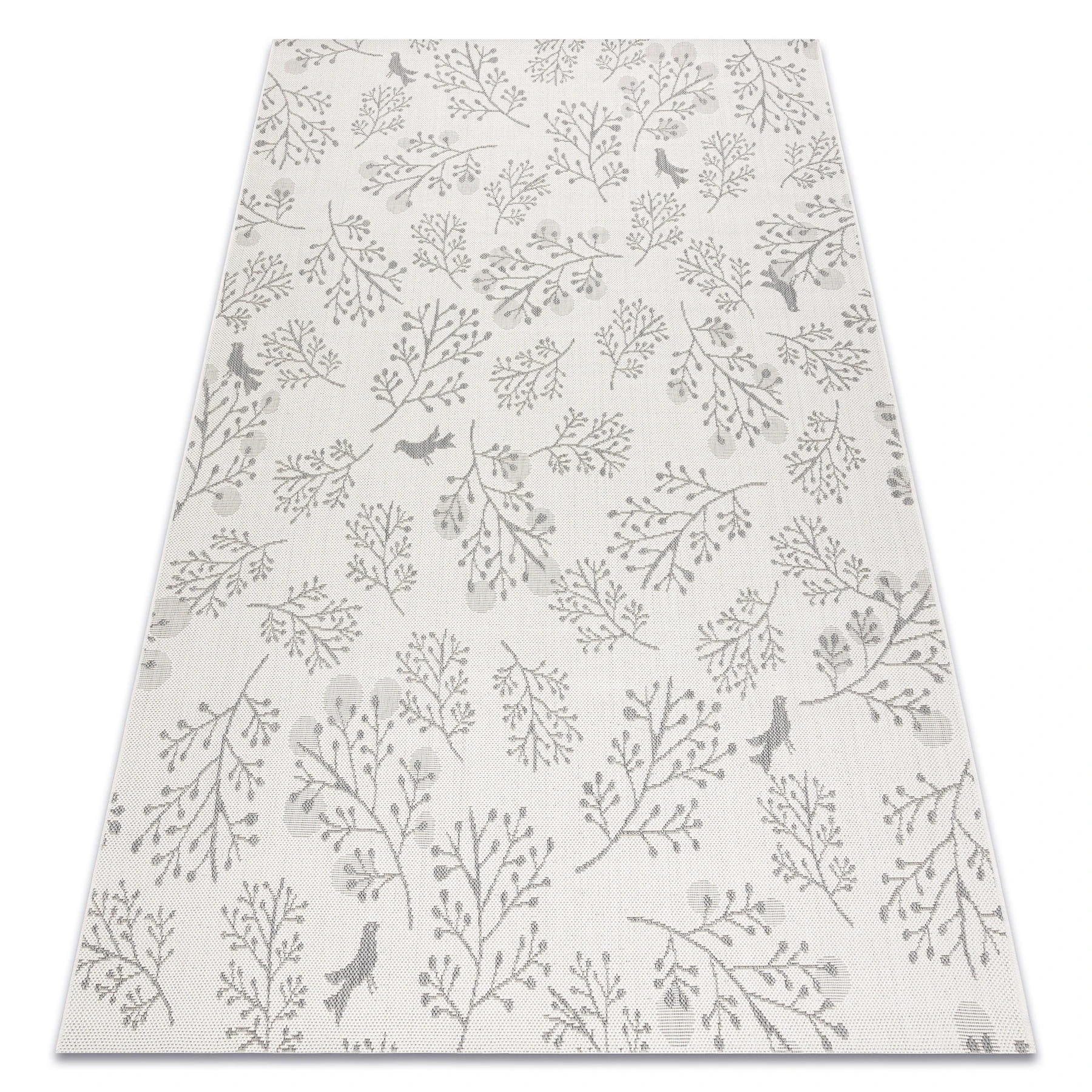 Sznurkowy dywan w odcieniach szarości z motywem ptaszków, odporny na warunki atmosferyczne, idealny na taras i balkon.