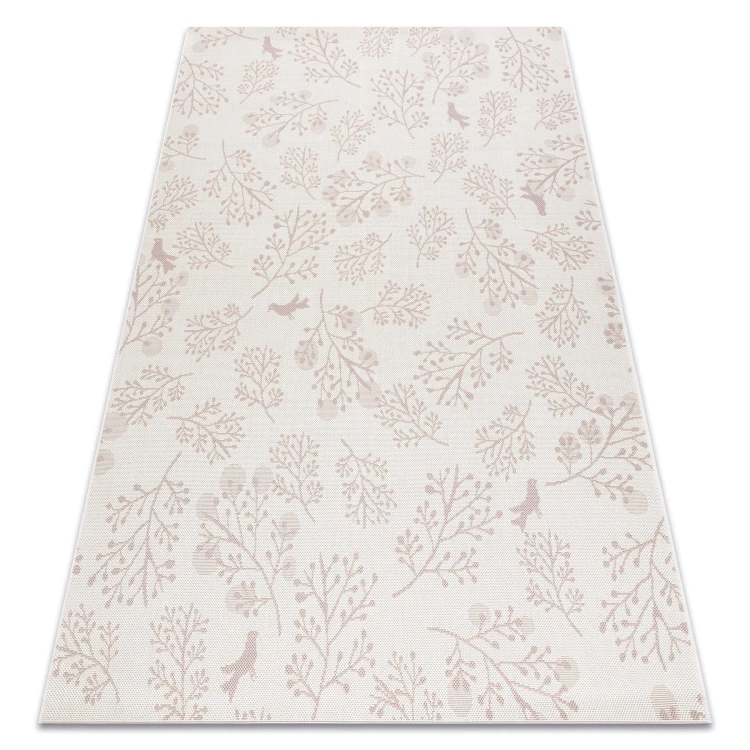 Kremowy dywan ze zwierzęcym motywem listków i ptaszków, który wprowadzi do salonu naturalny charakter i subtelną elegancję.