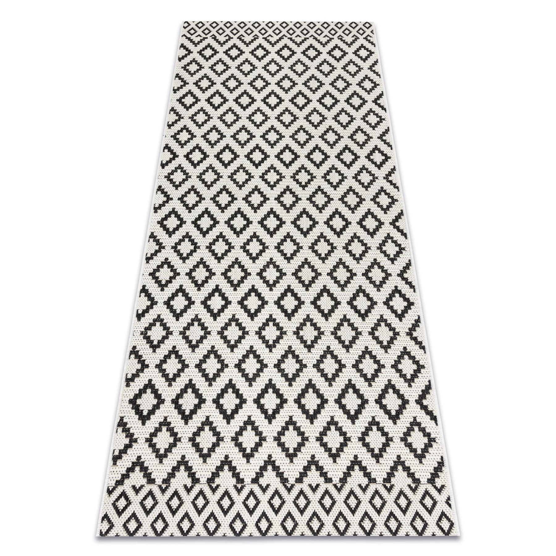 Kremowy dywan z czarnymi rombami w sznurkowej strukturze, który doskonale sprawdzi się w korytarzu, nadając mu nowoczesny charakter.