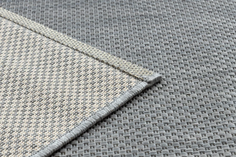 Sznurkowy dywan w odcieniu srebra, odporny na warunki atmosferyczne, idealny na taras i balkon.