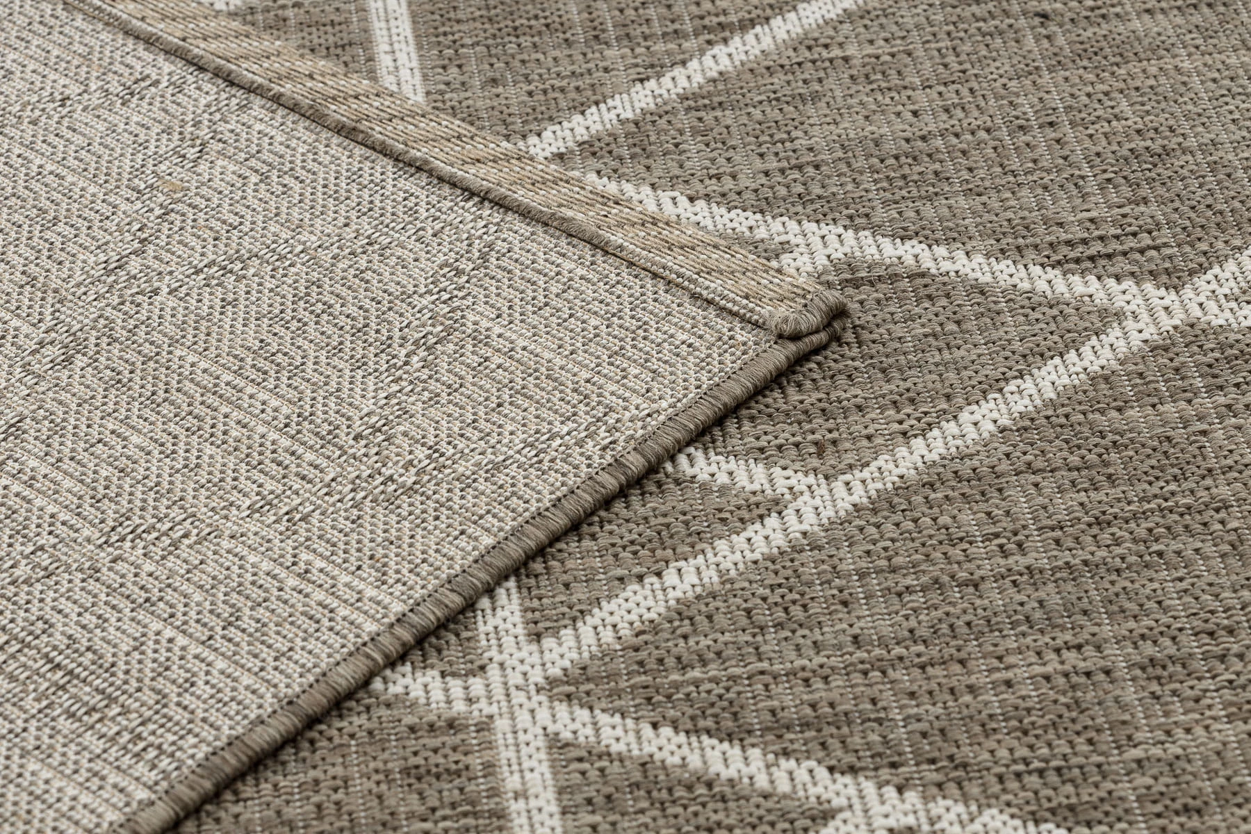 Sznurkowy dywan z geometrycznym motywem trójkątów w odcieniach beżu i szampańskiego, odporny na warunki atmosferyczne, idealny na taras i balkon.