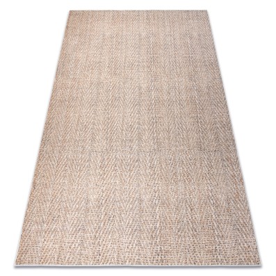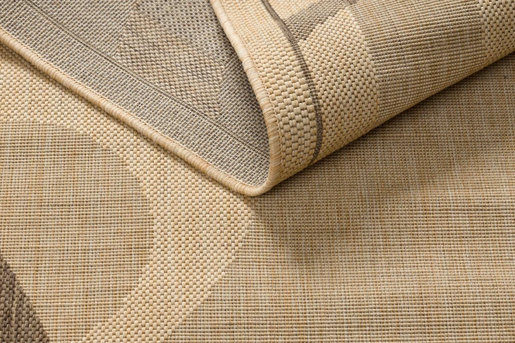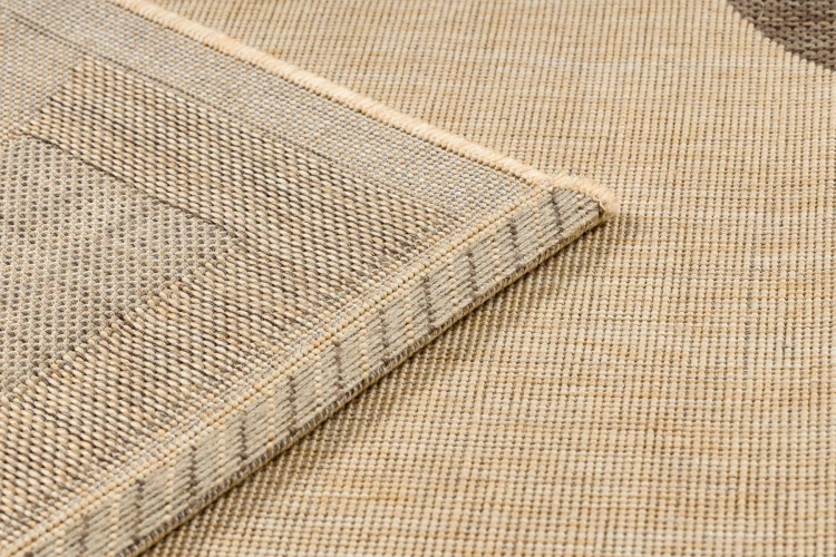 Sznurkowy dywan w odcieniach beżu i brązu, odporny na warunki atmosferyczne, idealny na taras i balkon.