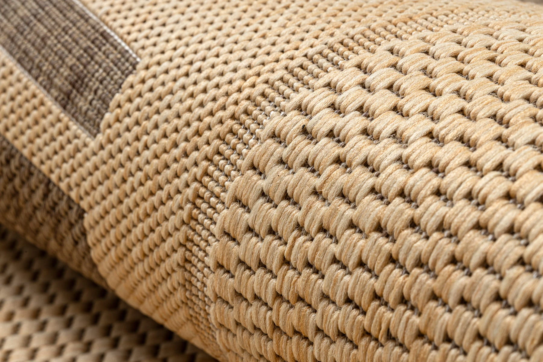 Sznurkowy dywan w odcieniach beżu i brązu z ramką, odporny na warunki atmosferyczne, idealny na taras i balkon.