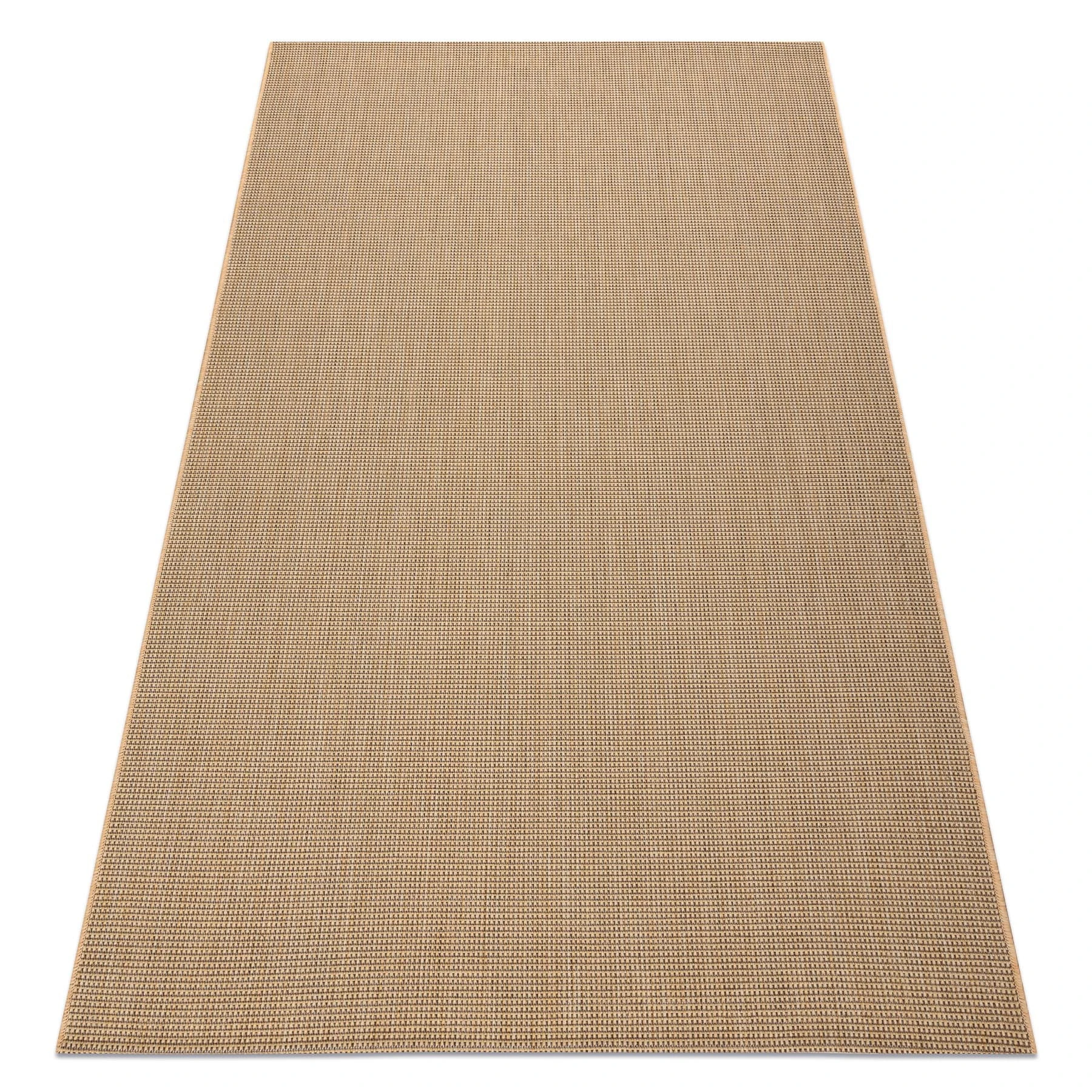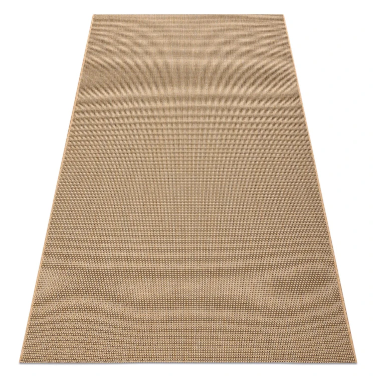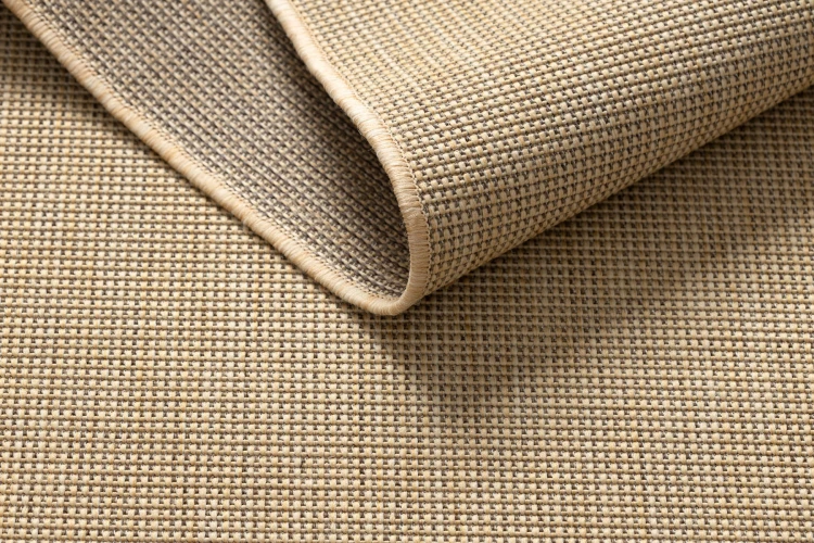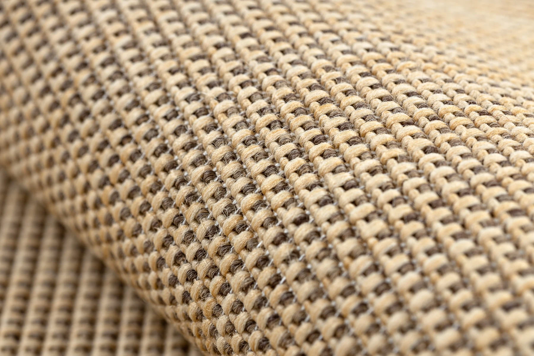 Sznurkowy dywan w odcieniach beżu i brązu, odporny na warunki atmosferyczne, idealny na taras i balkon.