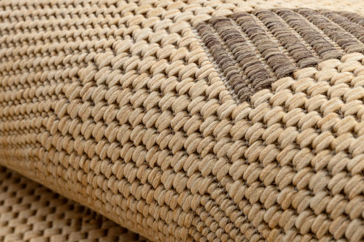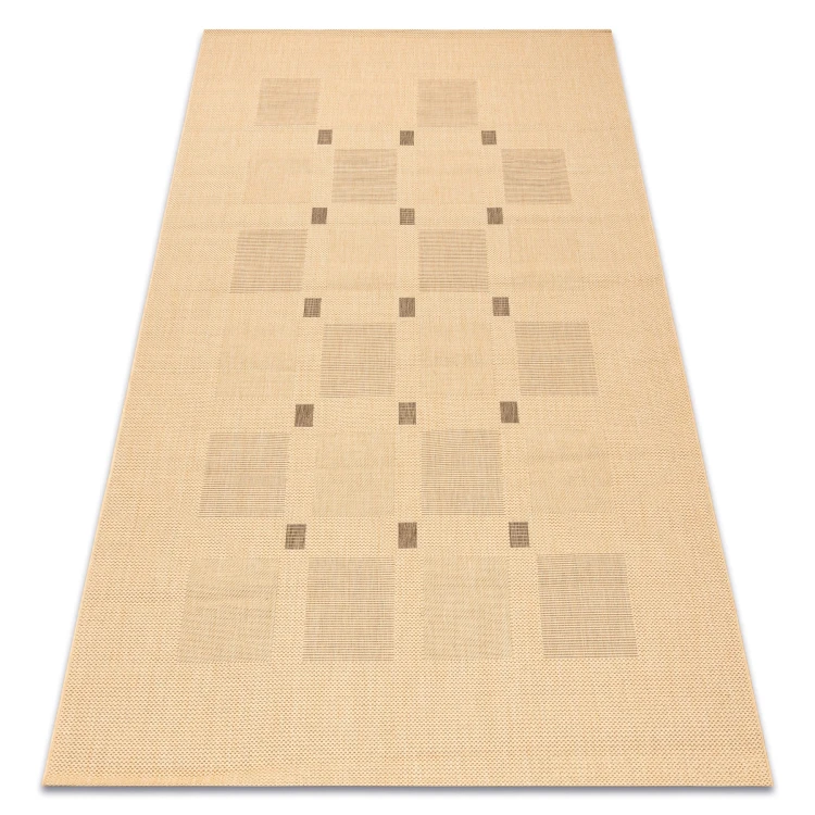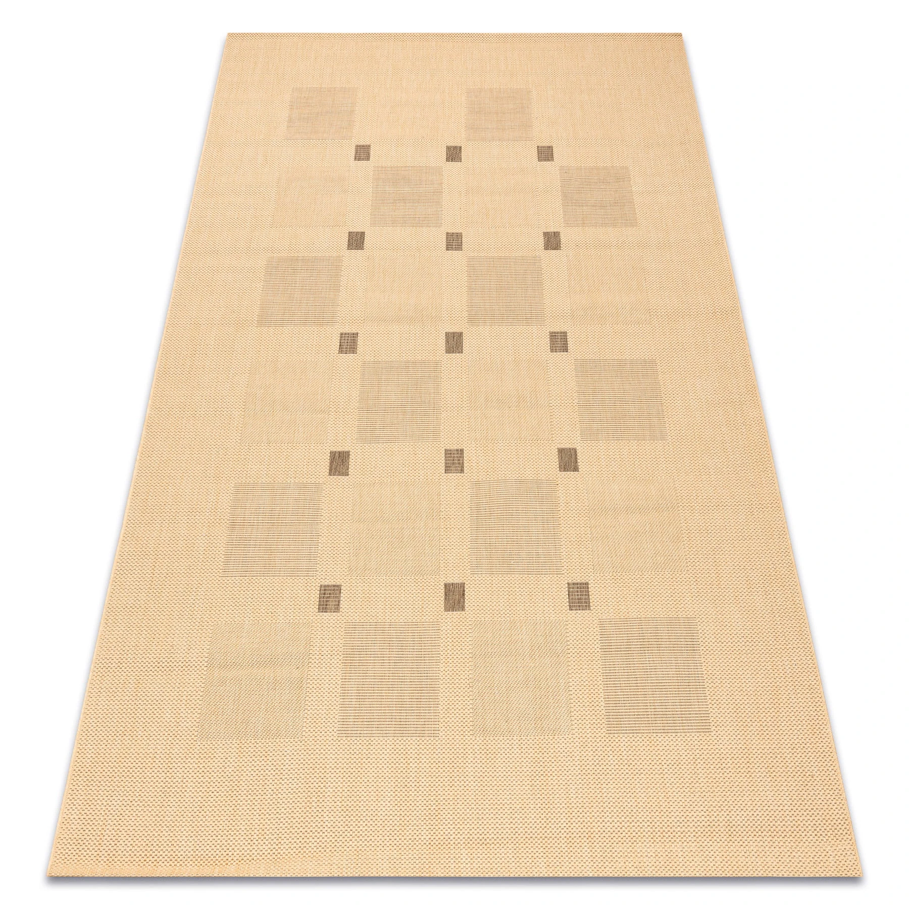 Sznurkowy dywan w odcieniach beżu i brązu z motywem kratki, odporny na warunki atmosferyczne, idealny na taras i balkon.