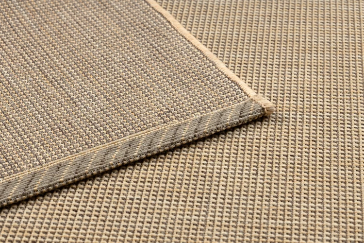 Sznurkowy dywan w odcieniach beżu i brązu, odporny na warunki atmosferyczne, idealny na taras i balkon.