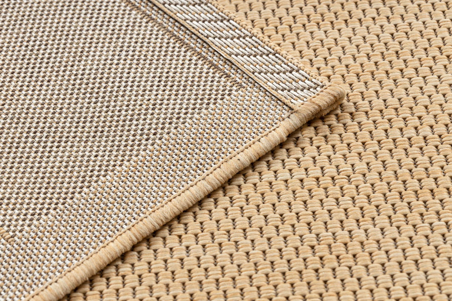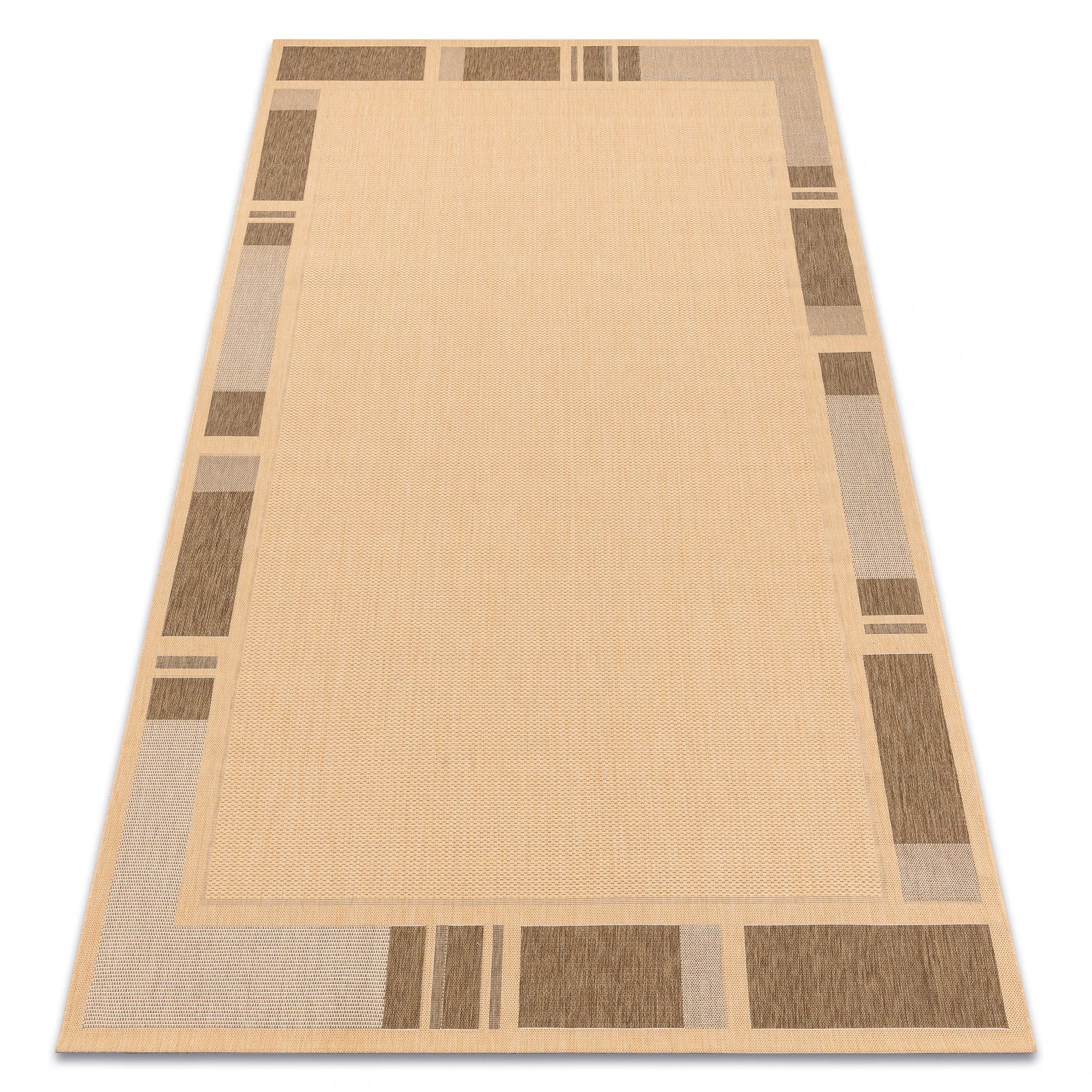 Sznurkowy dywan w odcieniach beżu i brązu z ramką, odporny na warunki atmosferyczne, idealny na taras i balkon.