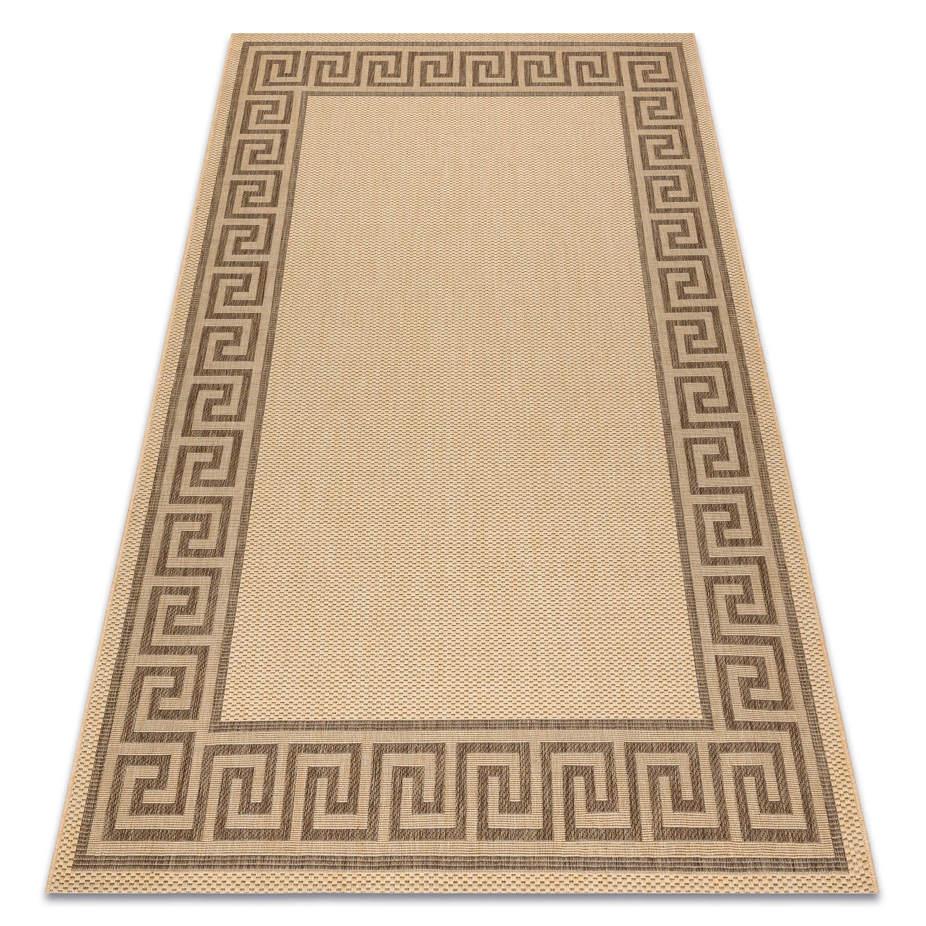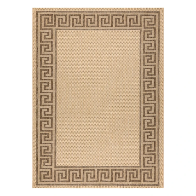 Sznurkowy dywan w odcieniach beżu z brązową ramką, odporny na warunki atmosferyczne, idealny na taras i balkon.