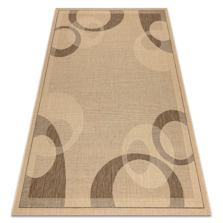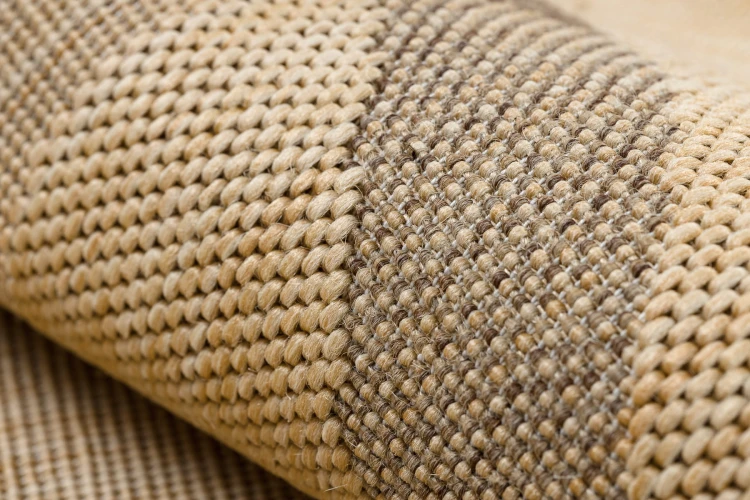 Sznurkowy dywan w odcieniach beżu, odporny na warunki atmosferyczne, idealny na taras i balkon.