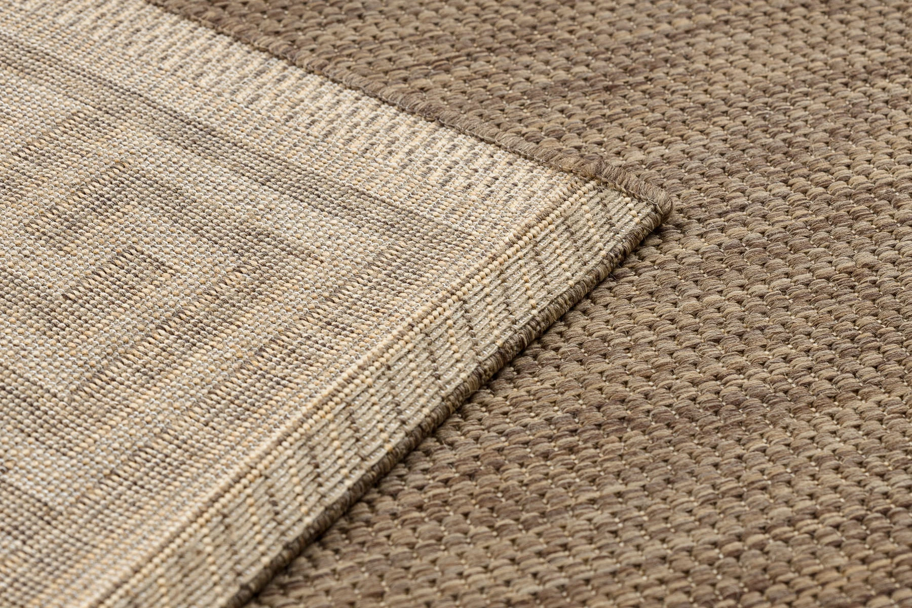 Sznurkowy dywan w odcieniach brązu i żółci, odporny na warunki atmosferyczne, idealny na taras i balkon.