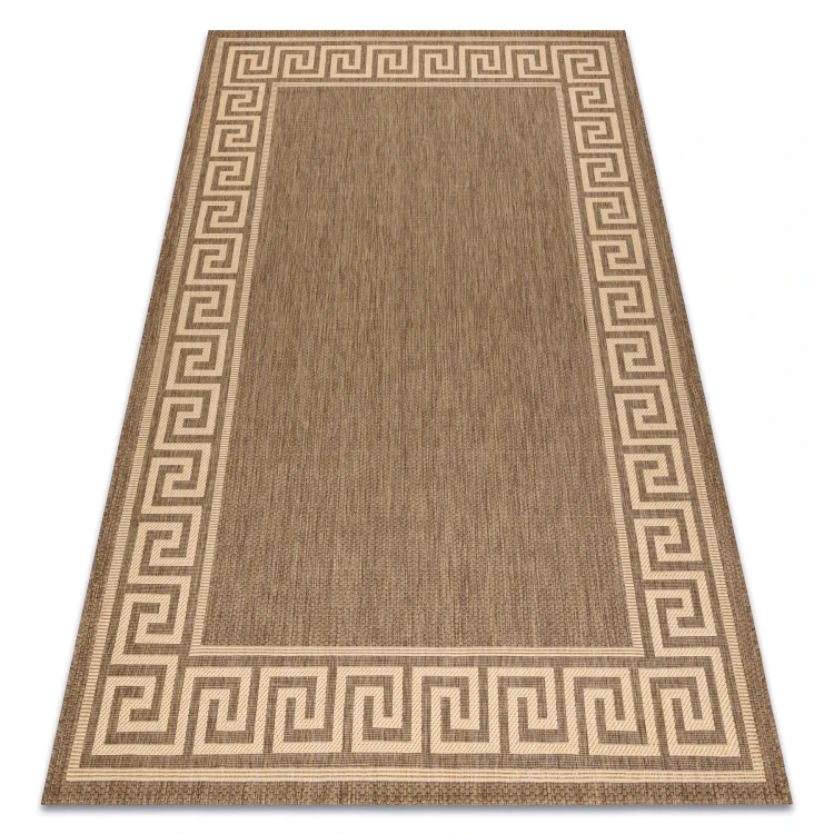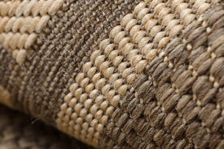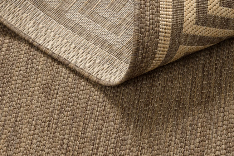 Sznurkowy dywan w odcieniach brązu i żółci, odporny na warunki atmosferyczne, idealny na taras i balkon.
