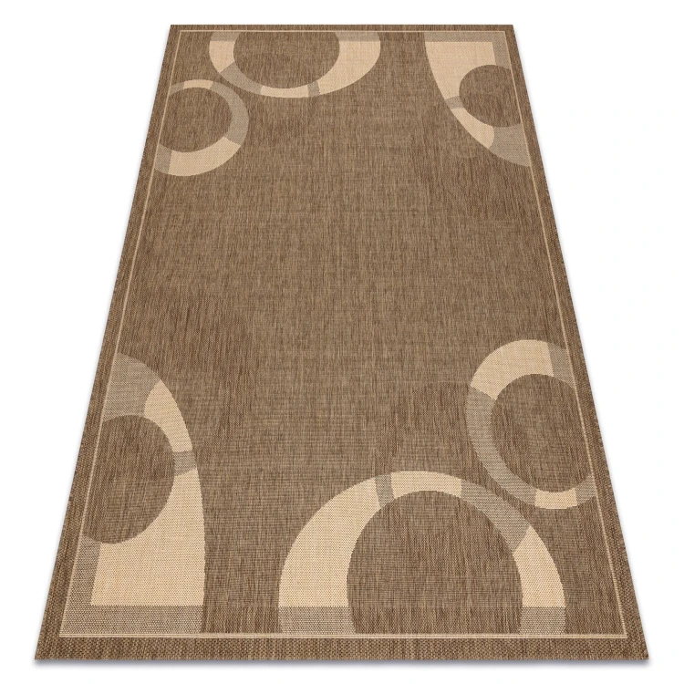 Sznurkowy dywan w odcieniach brązu i żółci, odporny na warunki atmosferyczne, idealny na taras i balkon.
