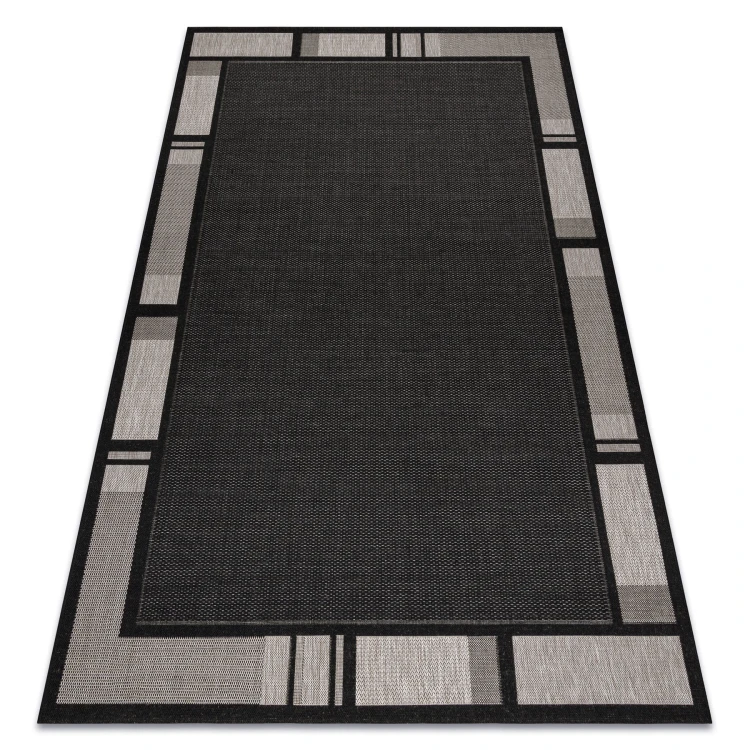 Sznurkowy dywan z ramką w czerni i srebrze, odporny na warunki atmosferyczne, idealny na taras i balkon.