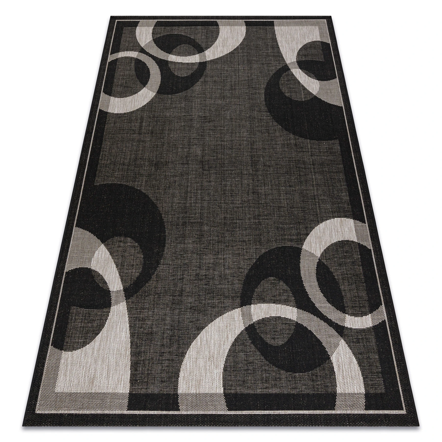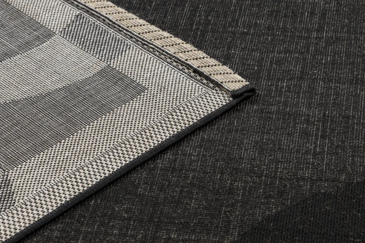 Sznurkowy dywan w czerni i srebrze z geometrycznym motywem, odporny na warunki atmosferyczne, idealny na taras i balkon.