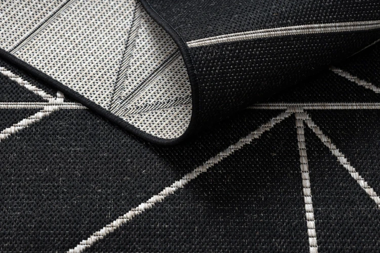 Sznurkowy dywan w czerni z dodatkiem srebra, odporny na warunki atmosferyczne, idealny na taras i balkon.