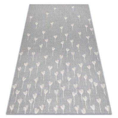 Sznurkowy dywan w odcieniach beżu i ciemnoszarości z motywem kwiatów, odporny na warunki atmosferyczne, idealny na taras i balkon.