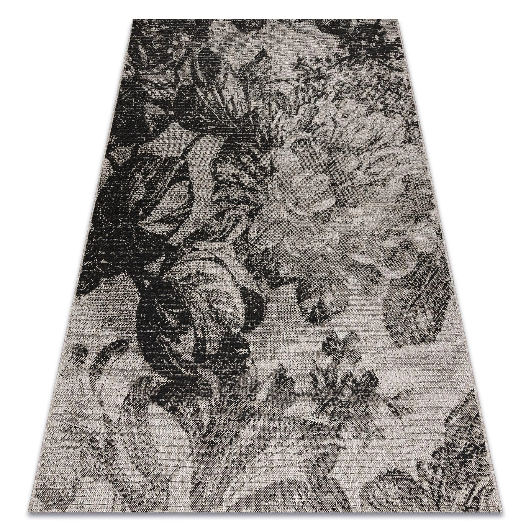 Sznurkowy dywan w odcieniach srebra i czerni z roślinnym motywem, odporny na warunki atmosferyczne, idealny na taras i balkon.