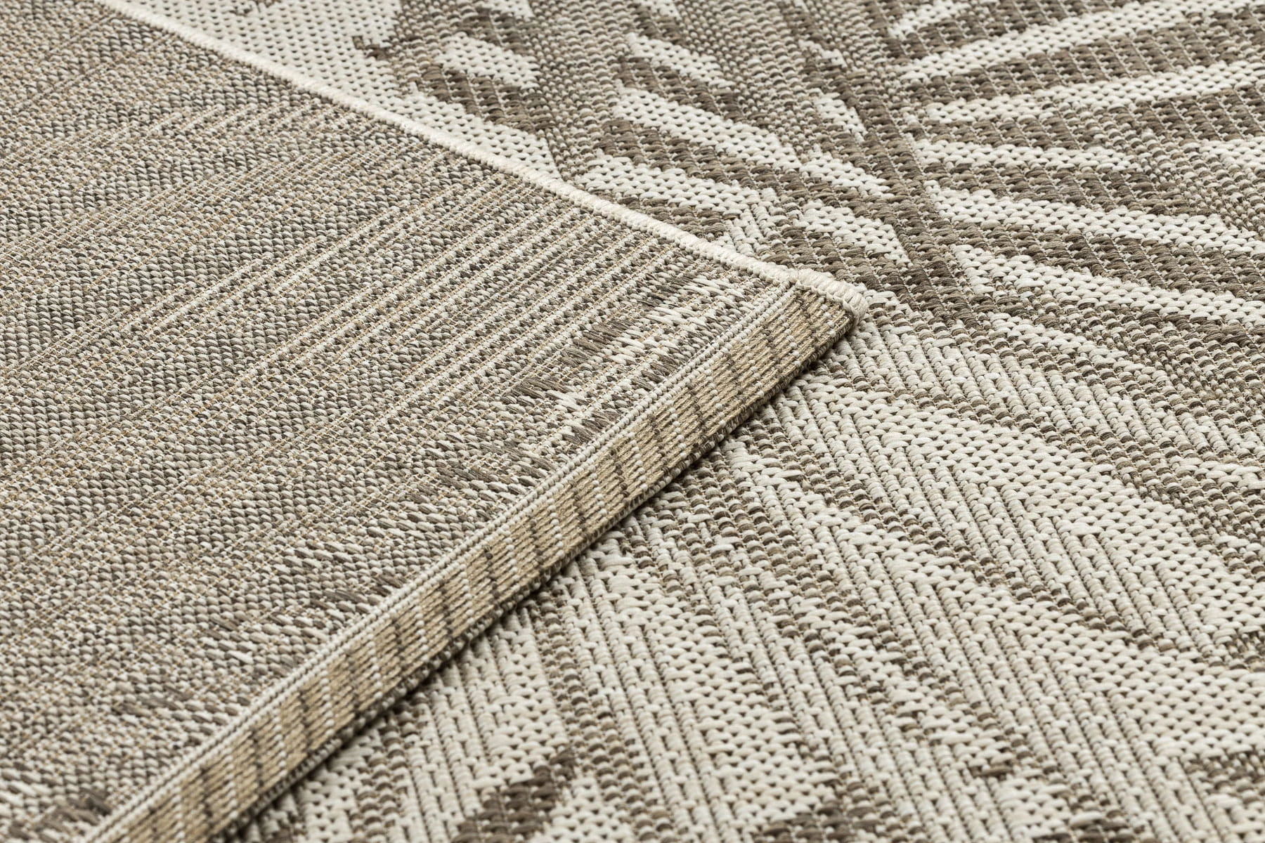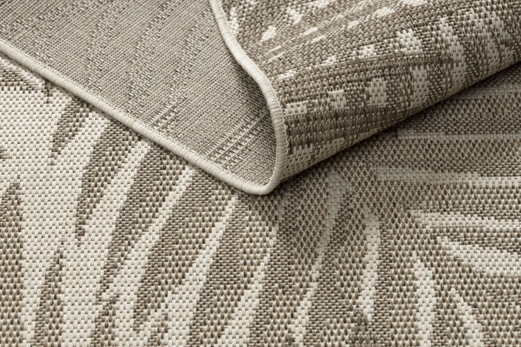 Sznurkowy dywan z motywem liści w odcieniach beżu i ciemnoszarości, odporny na warunki atmosferyczne, idealny na taras i balkon.