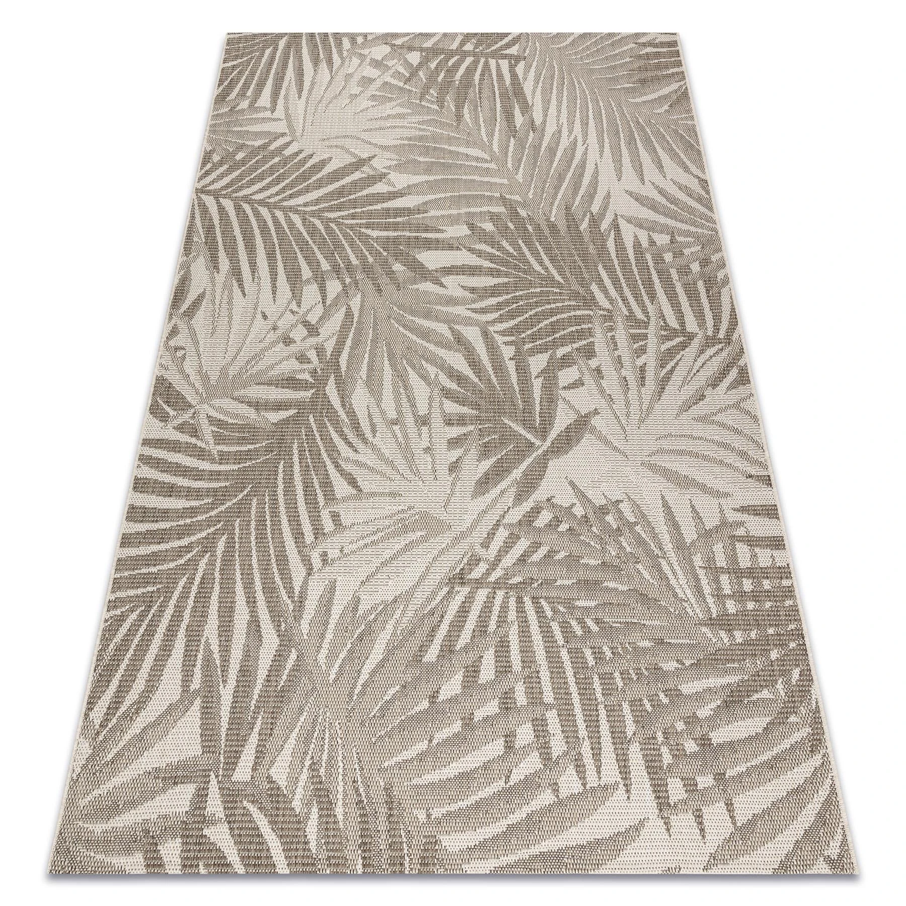 Sznurkowy dywan z motywem liści w odcieniach beżu i ciemnoszarości, odporny na warunki atmosferyczne, idealny na taras i balkon.