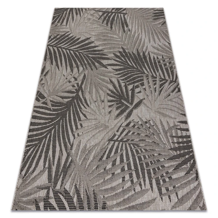 Sznurkowy dywan w odcieniach srebra z motywem liści, odporny na warunki atmosferyczne, idealny na taras i balkon.