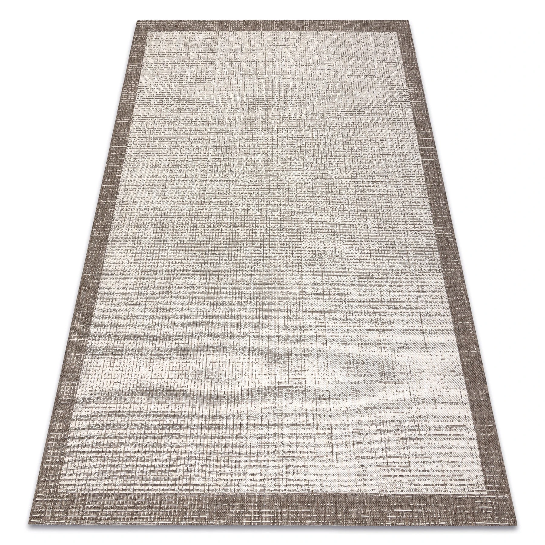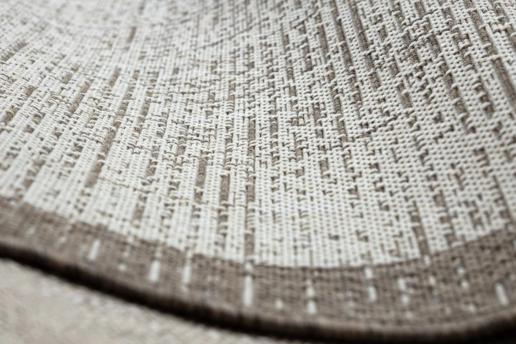 Sznurkowy dywan w odcieniu taupe z delikatną ramką, odporny na warunki atmosferyczne, idealny na taras i balkon.